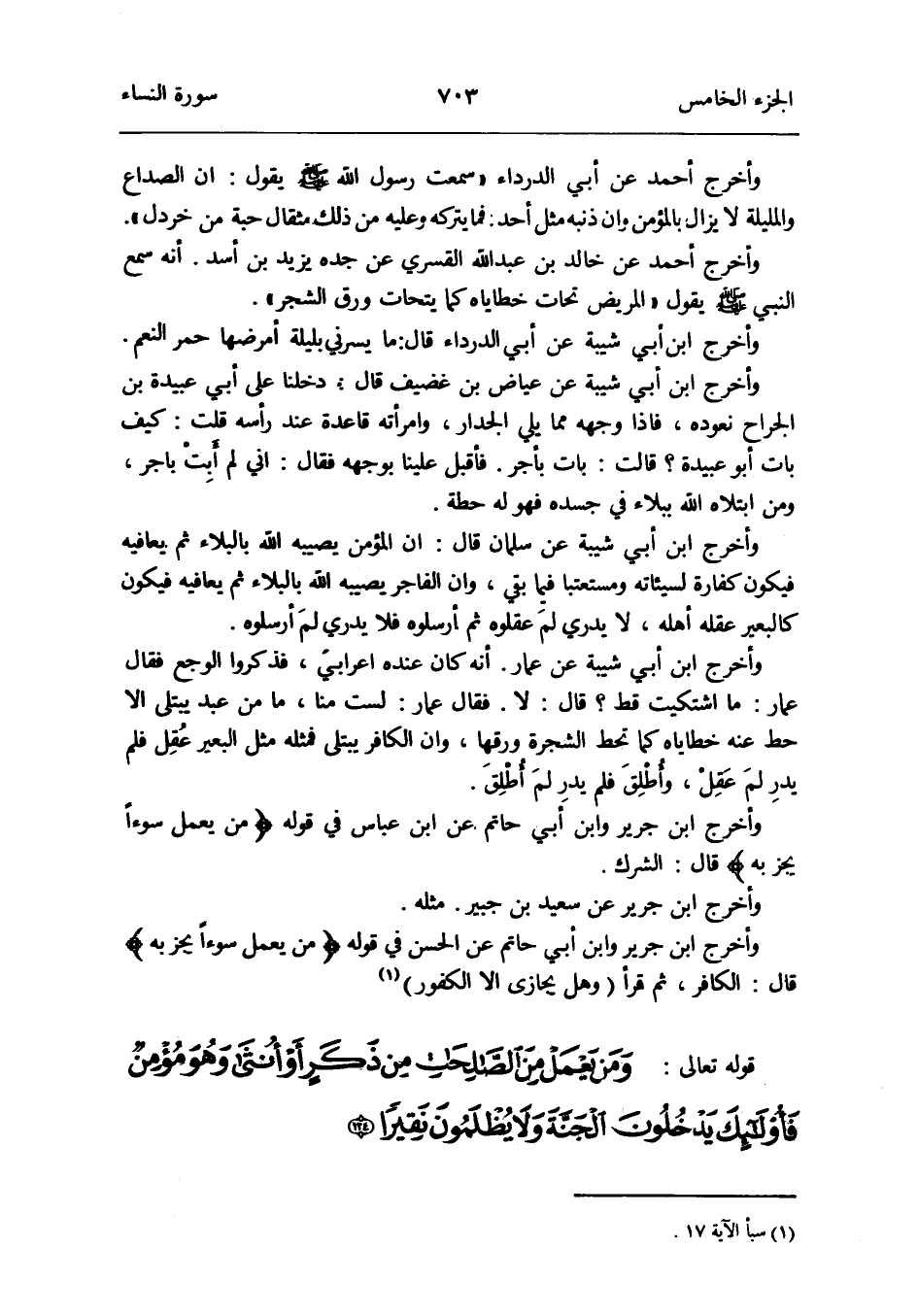 وَأخرج ابْن جرير وَابْن أبي حَاتِم عَن الْحسن فِي قَوْله {من يعْمل سوءا يجز بِهِ} قَالَ: الْكَافِر ثمَّ قَرَأَ (وَهل يجازى إِلَّا الكفور) (سبأ الْآيَة 17)