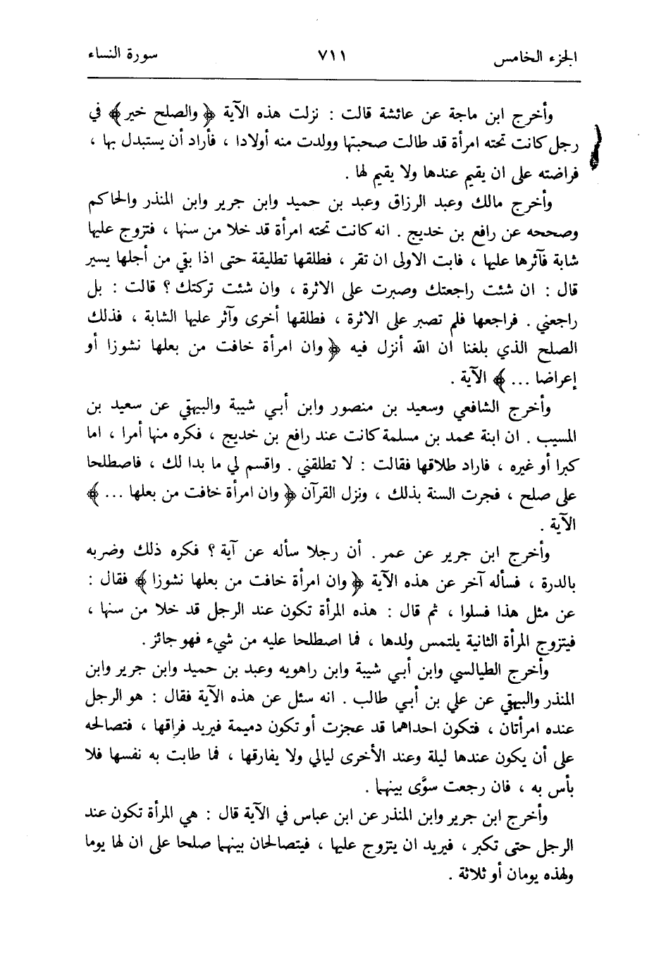 وَأخرج الشَّافِعِي وَسَعِيد بن مَنْصُور وَابْن أبي شيبَة وَالْبَيْهَقِيّ عَن سعيد ابْن الْمسيب أَن ابْنة مُحَمَّد بن مسلمة كَانَت عِنْد رَافع بن خديج فكره مِنْهَا أمرا إِمَّا كبرا أَو غَيره فَأَرَادَ طَلاقهَا فَقَالَت: لَا تُطَلِّقنِي واقسم لي مَا بدا لَك فاصطلحا على صلح فجرت السّنة بذلك وَنزل الْقُرْآن {وَإِن امْرَأَة خَافت من بَعْلهَا} الْآيَة