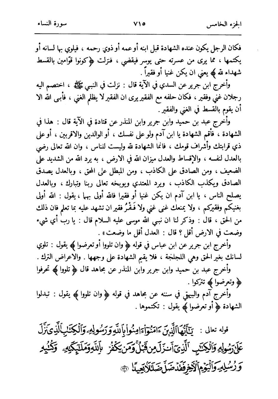 فَكَانَ الرجل يكون عِنْده الشَّهَادَة قبل ابْنه أَو عَمه أَو ذَوي رَحمَه فيلوي بهَا لِسَانه أَو يكتمها مِمَّا يرى من عسرته حَتَّى يوسر فَيَقْضِي فَنزلت {كونُوا قوّامين بِالْقِسْطِ شُهَدَاء لله} يَعْنِي إِن يكن غَنِيا أَو فَقِيرا