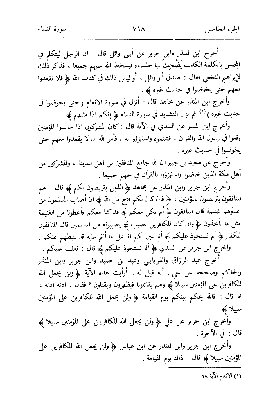 وَأخرج ابْن الْمُنْذر عَن مُجَاهِد قَالَ: أنزل فِي سُورَة الْأَنْعَام (حَتَّى يخوضوا فِي حَدِيث غَيره) (الْأَنْعَام الْآيَة 68) ثمَّ نزل التَّشْدِيد فِي سُورَة النِّسَاء {إِنَّكُم إِذا مثلهم}