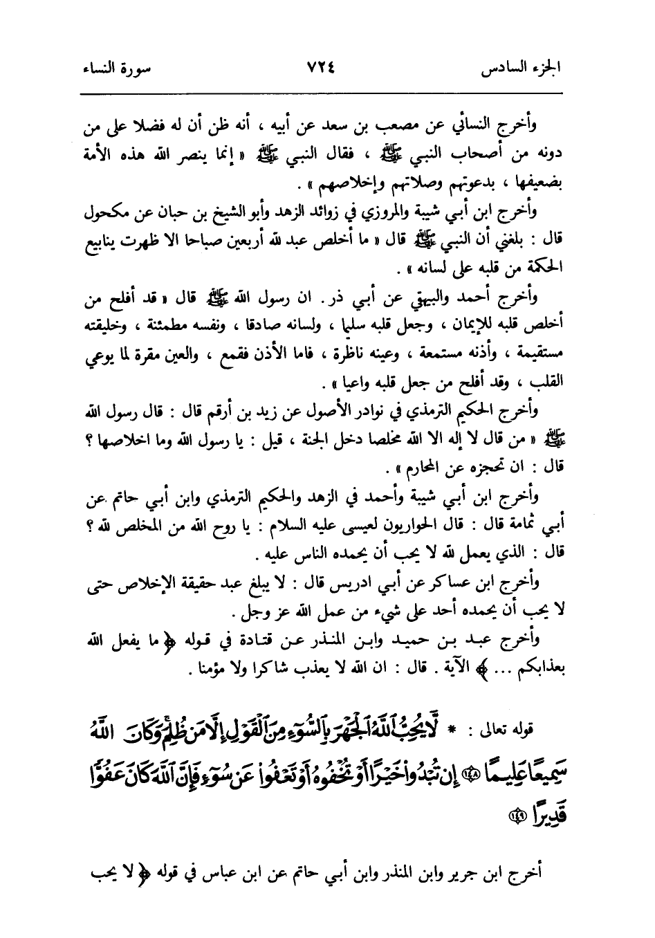 وَأخرج ابْن أبي شيبَة والمروزي فِي زَوَائِد الزّهْد وَأَبُو الشَّيْخ بن حبَان عَن مَكْحُول قَالَ: بَلغنِي أَن النَّبِي صلى الله عَلَيْهِ وَسلم قَالَ: مَا أخْلص عبد لله أَرْبَعِينَ صباحاً إِلَّا ظَهرت ينابيع الْحِكْمَة من قلبه على لِسَانه