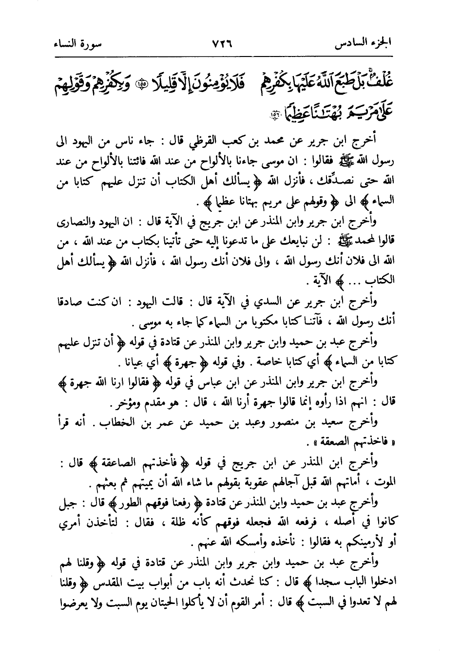 أخرج ابْن جرير عَن مُحَمَّد بن كَعْب الْقرظِيّ قَالَ: جَاءَ نَاس من الْيَهُود إِلَى رَسُول الله صلى الله عَلَيْهِ وَسلم فَقَالُوا: إِن مُوسَى جَاءَنَا بالألواح من عِنْد الله فائتنا بالألواح من عِنْد الله حَتَّى نصدقِّك فَأنْزل الله {يَسْأَلك أهل الْكتاب أَن تنزل عَلَيْهِم كتابا من السَّمَاء} إِلَى {وَقَوْلهمْ على مَرْيَم بهتاناً عَظِيما}