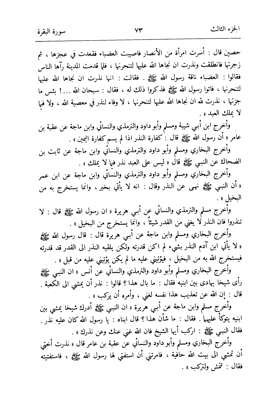 وَأخرج البُخَارِيّ وَمُسلم وَأَبُو دَاوُد وَالنَّسَائِيّ عَن عقبَة بن عَامر قَالَ: نذرت أُخْتِي أَن تمشي إِلَى بَيت الله حافية فأمرتني أَن استفتي لَهَا رَسُول الله صلى الله عَلَيْهِ وَسلم فاستفتيته فَقَالَ: لتمش ولتركب