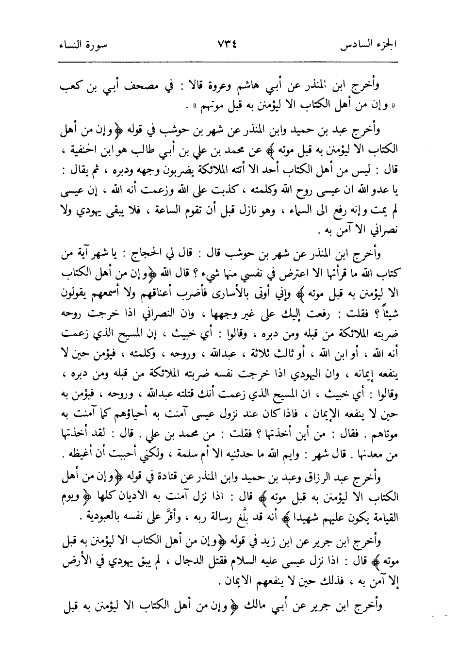 وَأخرج ابْن الْمُنْذر عَن شهر بن حَوْشَب قَالَ: قَالَ لي الْحجَّاج: يَا شهر آيَة من كتاب الله مَا قرأتها إِلَّا اعْترض فِي نَفسِي مِنْهَا شَيْء قَالَ الله {وَإِن من أهل الْكتاب إِلَّا ليُؤْمِنن بِهِ قبل مَوته} وَإِنِّي أُوتى بالأسارى فَأَضْرب أَعْنَاقهم وَلَا أسمعهم يَقُولُونَ شَيْئا فَقلت: رفعت إِلَيْك على غير وَجههَا وَإِن النَّصْرَانِي إِذا خرجت روحه ضَربته الْمَلَائِكَة من قبله وَمن دبره وَقَالُوا: أَي خَبِيث إِن الْمَسِيح الَّذِي زعمت أَنه الله أَو ابْن الله أَو ثَالِث ثَلَاثَة عبد الله وروحه وكلمته فَيُؤمن حِين لَا يَنْفَعهُ إيمَانه وَإِن الْيَهُودِيّ إِذا خرجت نَفسه ضَربته الْمَلَائِكَة من قبله وَمن دبره وَقَالُوا: أَي خَبِيث إِن الْمَسِيح الَّذِي زعمت أَنَّك قتلته عبد الله وروحه فَيُؤمن بِهِ حِين لَا يَنْفَعهُ الْإِيمَان فَإِذا كَانَ عِنْد نزُول عِيسَى آمَنت بِهِ أحياؤهم كَمَا آمَنت بِهِ موتاهم