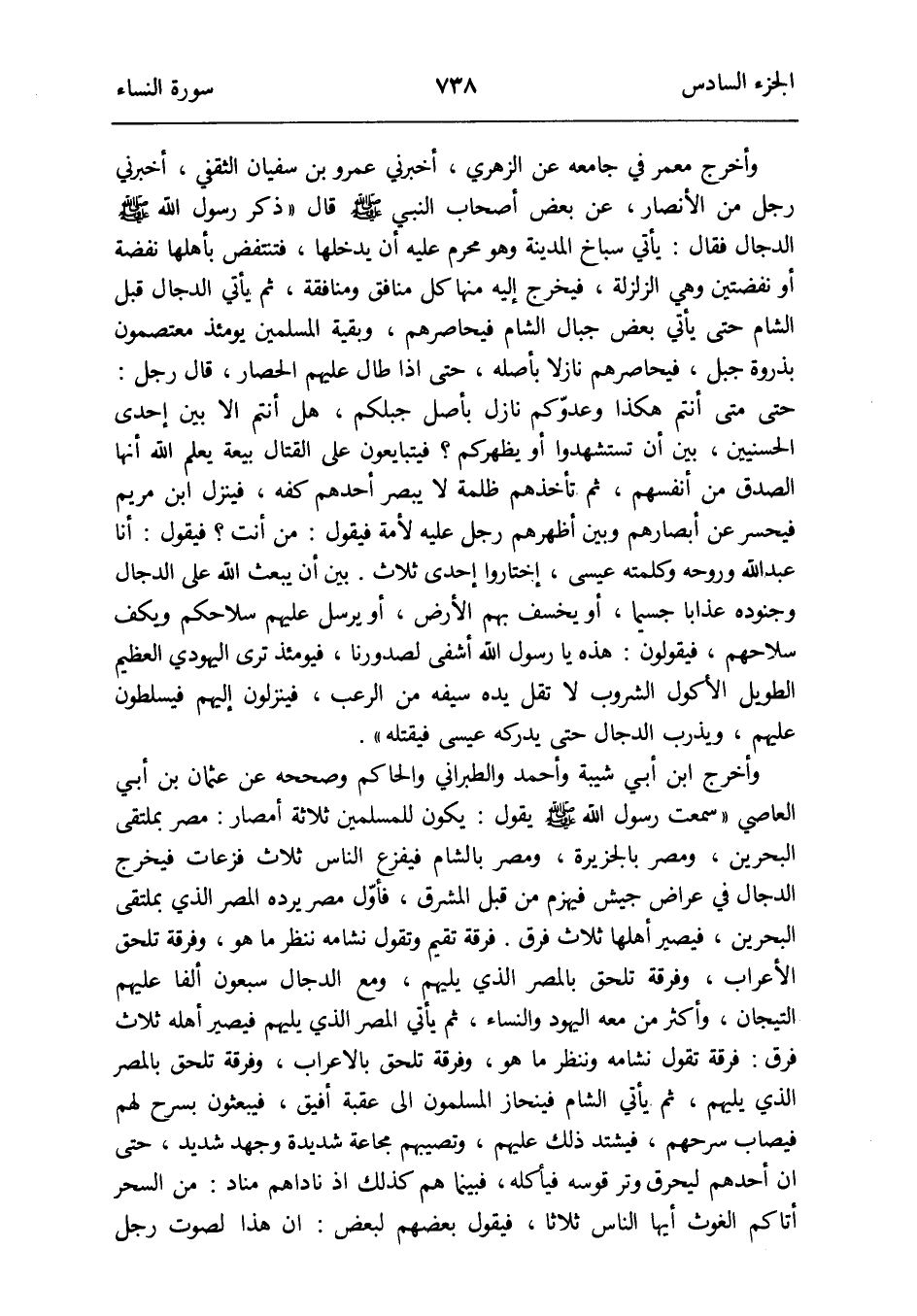 وَأخرج معمر فِي جَامعه عَن الزُّهْرِيّ أَخْبرنِي عَمْرو بن سُفْيَان الثَّقَفِيّ أَخْبرنِي رجل من الْأَنْصَار عَن بعض أَصْحَاب النَّبِي صلى الله عَلَيْهِ وَسلم قَالَ: ذكر رَسُول الله صلى الله عَلَيْهِ وَسلم الدَّجَّال فَقَالَ: يَأْتِي سباخ الْمَدِينَة وَهُوَ محرم عَلَيْهِ أَن يدخلهَا فتنتفض بِأَهْلِهَا نفضة أَو نفضتين وَهِي الزلزلة فَيخرج إِلَيْهِ مِنْهَا كل مُنَافِق وَمُنَافِقَة ثمَّ يَأْتِي الدَّجَّال قبل الشَّام حَتَّى يَأْتِي بعض جبال الشَّام فيحاصرهم وَبَقِيَّة الْمُسلمُونَ يَوْمئِذٍ معتصمون بِذرْوَةِ جبل فيحاصرهم نازلاً بِأَصْلِهِ حَتَّى إِذا طَال عَلَيْهِم الْحصار قَالَ رجل: حَتَّى مَتى أَنْتُم هَكَذَا وعدوّكم نَازل بِأَصْل جبلكم هَل أَنْتُم إِلَّا بَين إِحْدَى الحسنيين بَين أَن تستشهدوا أَو يظهركم فيتبايعون على الْقِتَال بيعَة يعلم الله أَنَّهَا الصدْق من أنفسهم ثمَّ تأخذهم ظلمَة لَا يبصر أحدهم كَفه فَينزل ابْن مَرْيَم فيحسر عَن أَبْصَارهم وَبَين أظهرهم رجل عَلَيْهِ لأمة فَيَقُول: من أَنْت فَيَقُول: أَنا عبد الله وروحه وكلمته عِيسَى إختاروا إِحْدَى ثَلَاث: بَين أَن يبْعَث الله على الدَّجَّال وَجُنُوده عذَابا جسيماً أَو يخسف بهم الأَرْض أَو يُرْسل عَلَيْهِم سلاحكم ويكف سِلَاحهمْ فَيَقُولُونَ: هَذِه يَا رَسُول الله أشفى لصدرونا فَيَوْمئِذٍ ترى الْيَهُودِيّ الْعَظِيم الطَّوِيل الأكول الشروب لَا تقل يَده سَيْفه من الرعب فينزلون إِلَيْهِم فيسلطون عَلَيْهِم ويذرب الدَّجَّال حَتَّى يُدْرِكهُ عِيسَى فيقتله