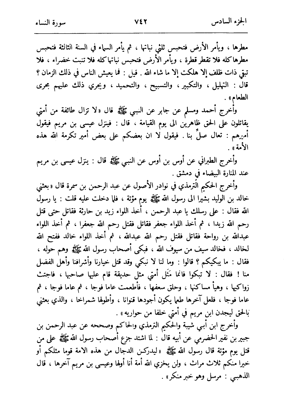 وَأخرج ابْن أبي شيبَة والحكيم التِّرْمِذِيّ وَالْحَاكِم وَصَححهُ عَن عبد الرَّحْمَن بن جُبَير بن نفير الْحَضْرَمِيّ عَن أَبِيه قَالَ: لما اشْتَدَّ جزع أَصْحَاب رَسُول الله صلى الله عَلَيْهِ وَسلم على من قتل يَوْم مُؤْتَة قَالَ رَسُول الله صلى الله عَلَيْهِ وَسلم: ليدركن الدَّجَّال من هَذِه الْأمة قوما مثلكُمْ أَو خيرا مِنْكُم ثَلَاث مَرَّات وَلنْ يخزي الله أمة أَنا أَولهَا وَعِيسَى بن مَرْيَم آخرهَا قَالَ الذَّهَبِيّ: مُرْسل وَهُوَ خبر مُنكر