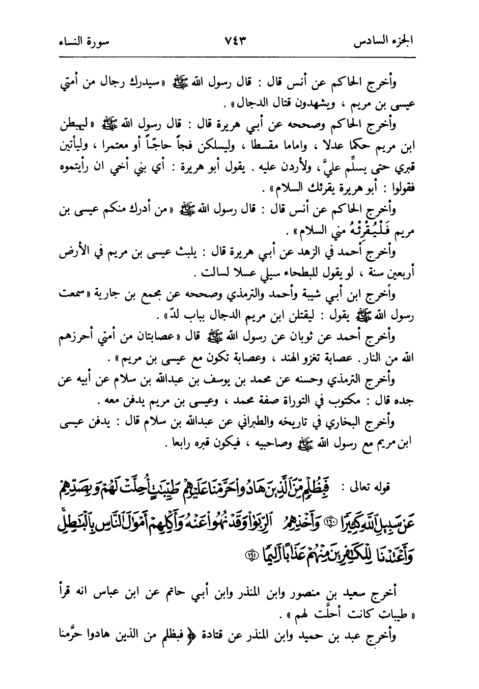 أخرج سعيد بن مَنْصُور وَابْن الْمُنْذر وَابْن أبي حَاتِم عَن ابْن عَبَّاس أَنه قَرَأَ طَيّبَات كَانَت أحل لَهُم