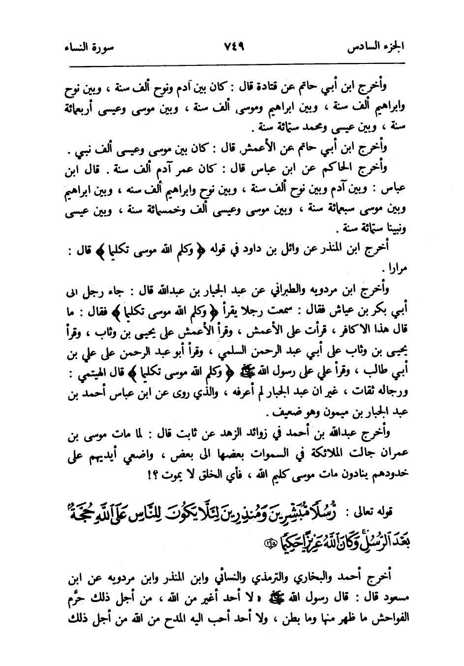وَأخرج ابْن مرْدَوَيْه وَالطَّبَرَانِيّ عَن عبد الْجَبَّار بن عبد الله قَالَ: جَاءَ رجل إِلَى أبي بكر بن عَيَّاش فَقَالَ: سَمِعت رجلا يقْرَأ {وكلم الله مُوسَى تكليماً} فَقَالَ: مَا قَالَ هَذَا إِلَّا كَافِر قَرَأت على الْأَعْمَش وَقَرَأَ الْأَعْمَش على يحيى بن وثاب وَقَرَأَ يحيى بن وثاب على أبي عبد الرَّحْمَن السّلمِيّ وَقَرَأَ أَبُو عبد الرَّحْمَن على عَليّ بن أبي طَالب وَقَرَأَ عَليّ على رَسُول الله صلى الله عَلَيْهِ وَسلم {وكلم الله مُوسَى تكليماً} قَالَ الهيثمي: وَرِجَاله ثِقَات غير أَن عبد الْجَبَّار لم أعرفهُ وَالَّذِي روى عَن ابْن عَبَّاس أَحْمد بن عبد الْجَبَّار بن مَيْمُون وَهُوَ ضَعِيف