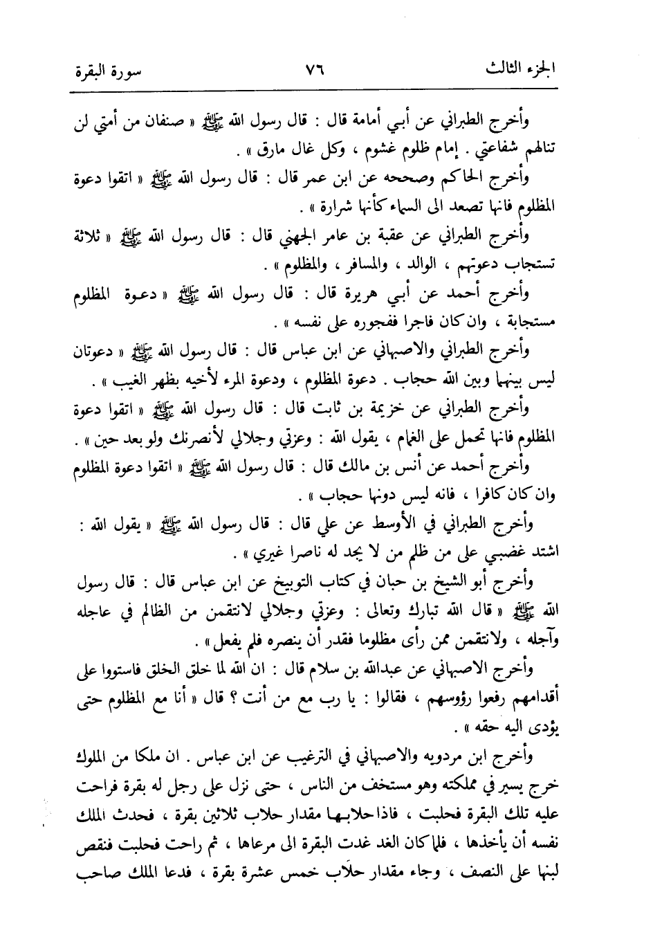 وَأخرج ابْن مرْدَوَيْه والأصبهاني فِي التَّرْغِيب عَن ابْن عَبَّاس أَن ملكا من الْمُلُوك خرج يسير فِي مَمْلَكَته وَهُوَ مستخف من النَّاس حَتَّى نزل على رجل لَهُ بقرة فراحت عَلَيْهِ تِلْكَ الْبَقَرَة فحلبت فَإِذا حلابها مِقْدَار حلاب ثَلَاثِينَ بقرة فَحدث الْملك نَفسه أَن يَأْخُذهَا فَلَمَّا كَانَ الْغَد غَدَتْ الْبَقَرَة إِلَى مرعاها ثمَّ راحت فحلبت فنقص لَبنهَا على النّصْف وَجَاء مِقْدَار حلاب خمس عشرَة بقرة فَدَعَا الْملك صَاحب