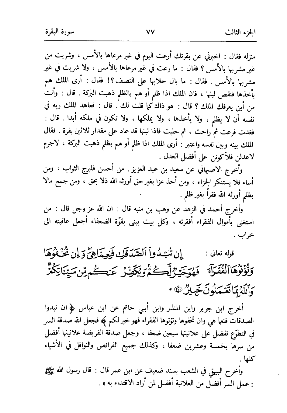 أخرج ابْن جرير وَابْن الْمُنْذر وَابْن أبي حَاتِم عَن ابْن عَبَّاس {إِن تبدوا الصَّدقَات فَنعما هِيَ وَإِن تخفوها وتؤتوها الْفُقَرَاء فَهُوَ خير لكم} فَجعل الله صَدَقَة السِّرّ فِي التَّطَوُّع تفضل على علانيتها سبعين ضعفا وَجعل صَدَقَة الْفَرِيضَة علانيتها أفضل من سرها بِخَمْسَة وَعشْرين ضعفا وَكَذَلِكَ جَمِيع الْفَرَائِض والنوافل فِي الْأَشْيَاء كلهَا