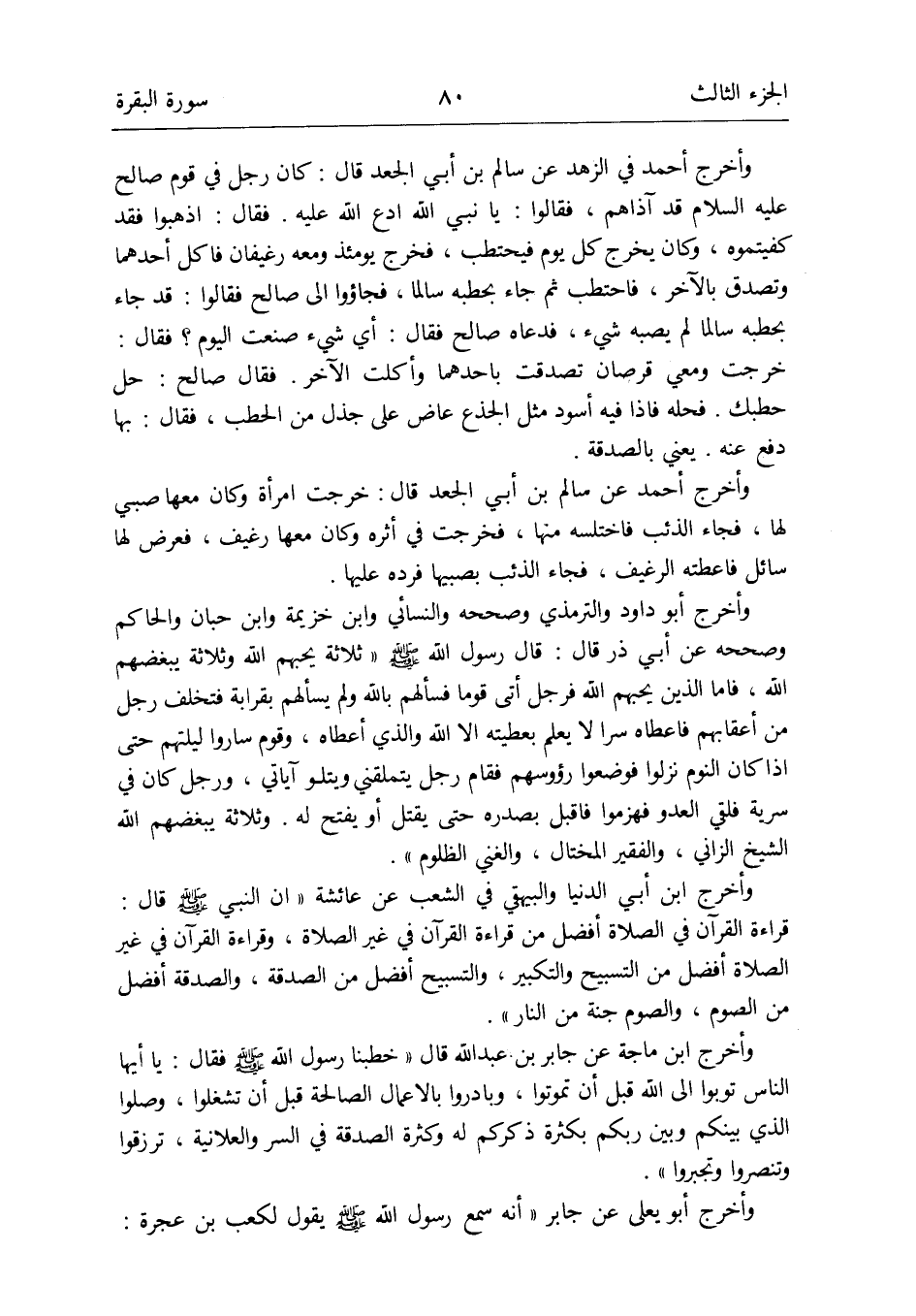 وَأخرج أَبُو دَاوُد وَالتِّرْمِذِيّ وَصَححهُ وَالنَّسَائِيّ وَابْن خُزَيْمَة وَابْن حبَان وَالْحَاكِم وَصَححهُ عَن أبي ذَر قَالَ: قَالَ رَسُول الله صلى الله عَلَيْهِ وَسلم ثَلَاثَة يُحِبهُمْ الله وَثَلَاثَة يبغضهم الله فَأَما الَّذين يُحِبهُمْ الله فَرجل أَتَى قوما فَسَأَلَهُمْ بِاللَّه وَلم يسألهم بِقرَابَة فَتخلف رجل من أَعْقَابهم فَأعْطَاهُ سرا لَا يعلم بعطيته إِلَّا الله وَالَّذِي أعطَاهُ وَقوم سَارُوا ليلتهم حَتَّى إِذا كَانَ النّوم نزلُوا فوضعوا رؤوسهم فَقَامَ رجل يتملقني وَيَتْلُو آياتي وَرجل كَانَ فِي سَرِيَّة فلقي الْعَدو فهزموا فَأقبل بصدره حَتَّى يقتل أَو يفتح لَهُ