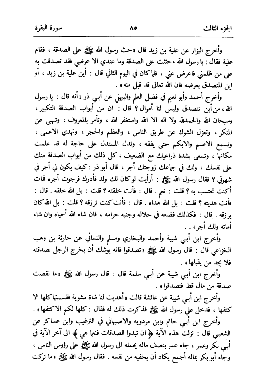 وَأخرج أَحْمد وَأَبُو نعيم فِي فضل الْعلم وَالْبَيْهَقِيّ عَن أبي ذَر أَنه قَالَ: يَا رَسُول الله من أَيْن نتصدق وَلَيْسَ لنا أَمْوَال قَالَ: أَن من أَبْوَاب الصَّدَقَة التَّكْبِير وَسُبْحَان الله وَالْحَمْد لله وَلَا إِلَه إِلَّا الله واستغفر الله وتأمر بِالْمَعْرُوفِ وتنهى عَن الْمُنكر وتعزل الشوك عَن طَرِيق النَّاس والعظم وَالْحجر وتهدي الْأَعْمَى وَتسمع الْأَصَم والأبكم حَتَّى يفقه وتدل الْمُسْتَدلّ على حَاجَة لَهُ قد علمت مَكَانهَا وتسعى بِشدَّة ذراعيك مَعَ الضَّعِيف كل ذَلِك من أَبْوَاب الصَّدَقَة مِنْك على نَفسك وَلَك فِي جماعك زَوجتك أجر قَالَ أَبُو ذَر: كَيفَ يكون لي أجر فِي شهوتي فَقَالَ رَسُول الله صلى الله عَلَيْهِ وَسلم: أَرَأَيْت لَو كَانَ لَك ولد فَأدْرك فرجوت أجره فَمَاتَ أَكنت تحتسب بِهِ قلت: نعم
