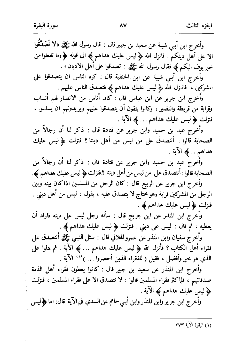 وَأخرج ابْن الْمُنْذر عَن سعيد بن جُبَير قَالَ: كَانُوا يُعْطون فُقَرَاء أهل الذِّمَّة صَدَقَاتهمْ فَلَمَّا كثر فُقَرَاء الْمُسلمين قَالُوا: لَا نتصدق إِلَّا على فُقَرَاء الْمُسلمين فَنزلت {لَيْسَ عَلَيْك هدَاهُم} الْآيَة