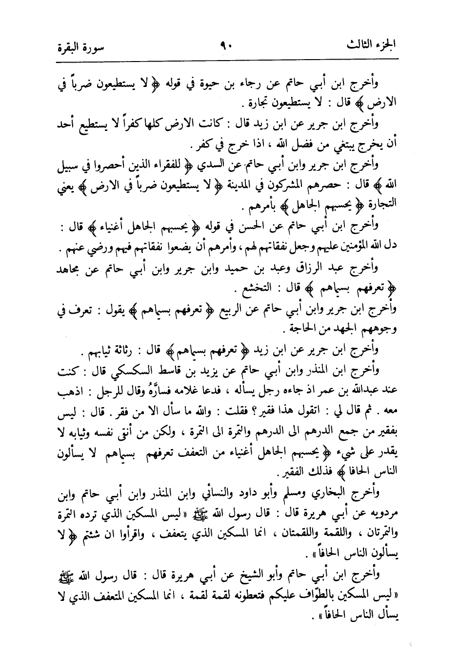 وَأخرج ابْن جرير وَابْن أبي حَاتِم عَن السّديّ {للْفُقَرَاء الَّذين أحْصرُوا فِي سَبِيل الله} قَالَ: حصرهم الْمُشْركُونَ فِي الْمَدِينَة {لَا يَسْتَطِيعُونَ ضربا فِي الأَرْض} يَعْنِي التِّجَارَة {يَحْسبهُم الْجَاهِل} بأمرهم
