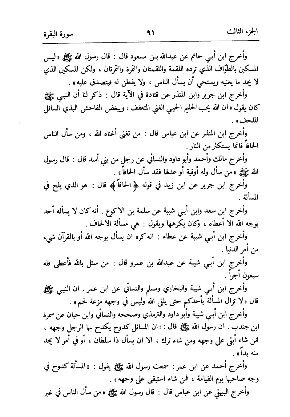وَأخرج ابْن أبي حَاتِم عَن عبد الله بن مَسْعُود قَالَ: قَالَ رَسُول الله صلى الله عَلَيْهِ وَسلم لَيْسَ الْمِسْكِين بالطوّاف الَّذِي ترده اللُّقْمَة وَاللُّقْمَتَانِ وَالتَّمْرَة وَالتَّمْرَتَانِ وَلَكِن الْمِسْكِين الَّذِي لَا يجد مَا يُغْنِيه ويستحي أَن يسْأَل النَّاس وَلَا يفْطن لَهُ فَيتَصَدَّق عَلَيْهِ