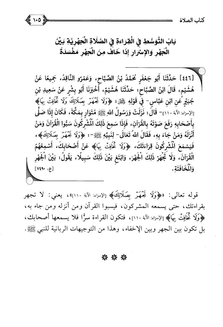 [٤٤٦] حَدَّثَنَا أَبُو جَعْفَرٍ مُحَمَّدُ بْنُ الصَّبَّاحِ، وَعَمْرٌو النَّاقِدُ، جَمِيعًا عَنْ هُشَيْمٍ، قَالَ ابْنُ الصَّبَّاحِ: حَدَّثَنَا هُشَيْمٌ، أَخْبَرَنَا أَبُو بِشْرٍ عَنْ سَعِيدِ بْنِ جُبَيْرٍ عَنِ ابْنِ عَبَّاسٍ- فِي قَوْلِهِ عز وجل: {وَلا تَجْهَرْ بِصَلاتِكَ وَلَا تُخَافِتْ بِهَا} - قَالَ: نَزَلَتْ وَرَسُولُ اللَّهِ صلى الله عليه وسلم مُتَوَارٍ بِمَكَّةَ، فَكَانَ إِذَا صَلَّى بِأَصْحَابِهِ رَفَعَ صَوْتَهُ بِالقُرْآنِ، فَإِذَا سَمِعَ ذَلِكَ الْمُشْرِكُونَ سَبُّوا الْقُرْآنَ وَمَنْ أَنْزَلَهُ وَمَنْ جَاءَ بِهِ، فَقَالَ اللَّهُ تَعَالَى- لِنَبِيِّهِ صلى الله عليه وسلم-: {وَلا تَجْهَرْ بِصَلاتِكَ}، فَيَسْمَعَ الْمُشْرِكُونَ قِرَاءَتَكَ، {وَلا تُخَافِتْ بِهَا} عَنْ أَصْحَابِكَ، أَسْمِعْهُمُ الْقُرْآنَ، وَلَا تَجْهَرْ ذَلِكَ الْجَهْرَ، وَابْتَغِ بَيْنَ ذَلِكَ سَبِيلًا، يَقُولُ: بَيْنَ الْجَهْرِ وَالْمُخَافَتَةِ.