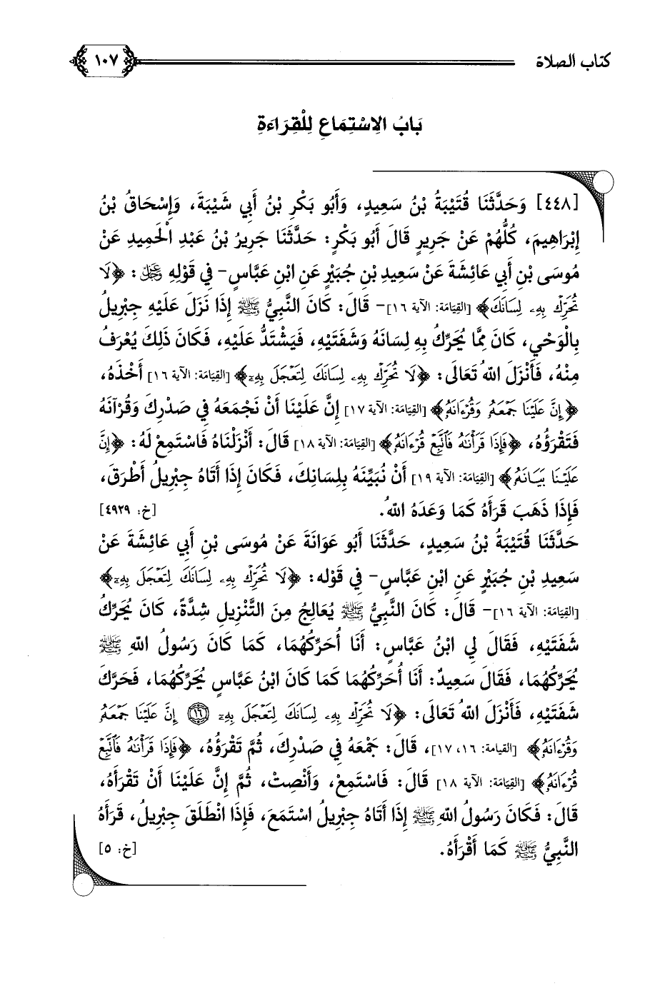 حَدَّثَنَا قُتَيْبَةُ بْنُ سَعِيدٍ، حَدَّثَنَا أَبُو عَوَانَةَ عَنْ مُوسَى بْنِ أَبِي عَائِشَةَ عَنْ سَعِيدِ بْنِ جُبَيْرٍ عَنِ ابْنِ عَبَّاسٍ- فِي قَوْله: {لا تُحَرِّكْ بِهِ لِسَانَكَ لِتَعْجَلَ بِهِ} - قَالَ: كَانَ النَّبِيُّ صلى الله عليه وسلم يُعَالِجُ مِنَ التَّنْزِيلِ شِدَّةً، كَانَ يُحَرِّكُ شَفَتَيْهِ، فَقَالَ لِي ابْنُ عَبَّاسٍ: أَنَا أُحَرِّكُهُمَا، كَمَا كَانَ رَسُولُ اللَّهِ صلى الله عليه وسلم يُحَرِّكُهُمَا، فَقَالَ سَعِيدٌ: أَنَا أُحَرِّكُهُمَا كَمَا كَانَ ابْنُ عَبَّاسٍ يُحَرِّكُهُمَا، فَحَرَّكَ شَفَتَيْهِ، فَأَنْزَلَ اللَّهُ تَعَالَى: {لا تُحَرِّكْ بِهِ لِسَانَكَ لِتَعْجَلَ بِهِ إِنَّ عَلَيْنَا جَمْعَهُ وَقُرْءَانَهُ}، قَالَ: جَمْعَهُ فِي صَدْرِكَ، ثُمَّ تَقْرَؤُهُ، {فَإِذَا قَرَأْنَاهُ فَاتَّبِعْ قُرْءَانَهُ} قَالَ: فَاسْتَمِعْ، وَأَنْصِتْ، ثُمَّ إِنَّ عَلَيْنَا أَنْ تَقْرَأَهُ، قَالَ: فَكَانَ رَسُولُ اللَّهِ صلى الله عليه وسلم إِذَا أَتَاهُ جِبْرِيلُ اسْتَمَعَ، فَإِذَا انْطَلَقَ جِبْرِيلُ، قَرَأَهُ النَّبِيُّ صلى الله عليه وسلم كَمَا أَقْرَأَهُ.