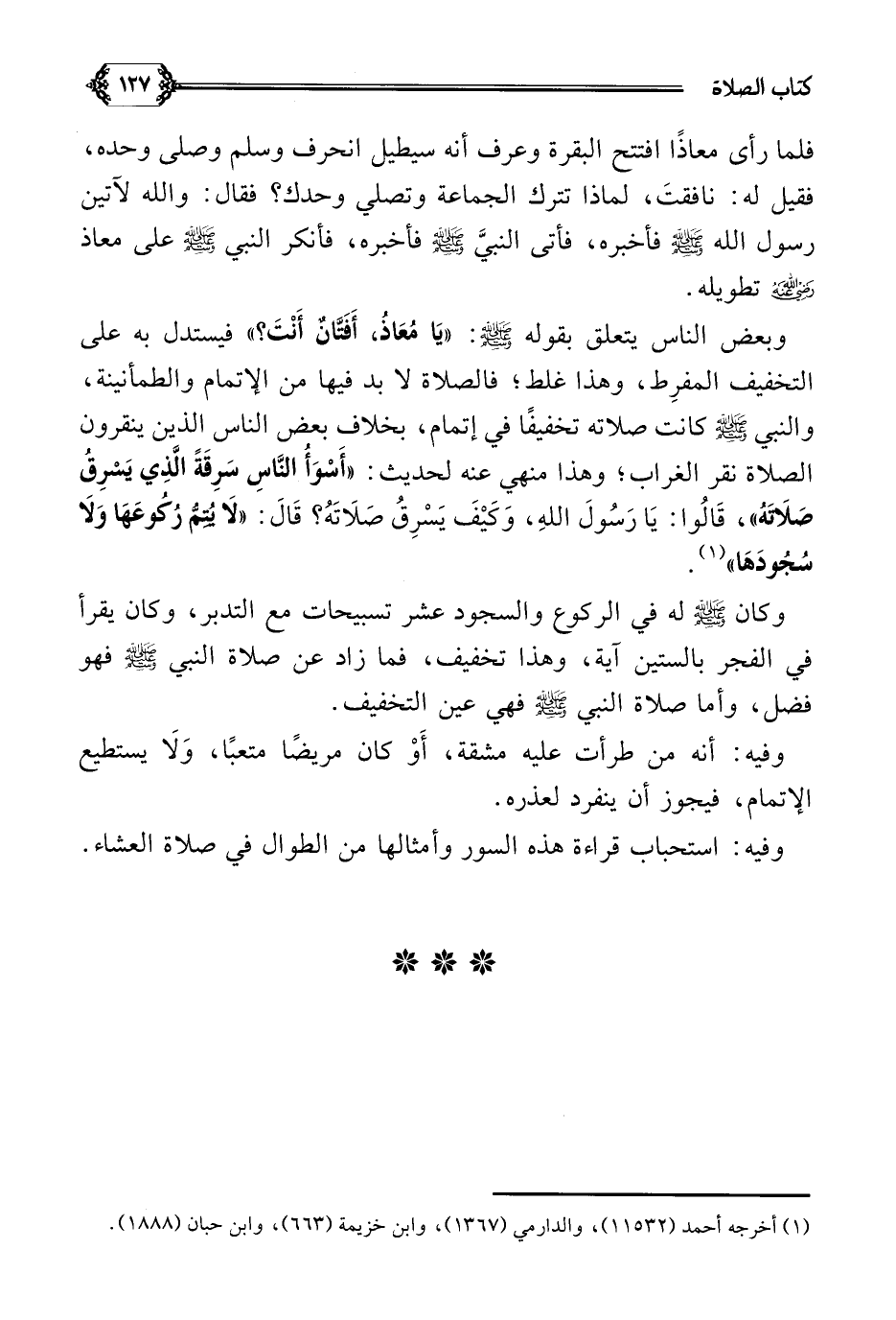 وبعض الناس يتعلق بقوله صلى الله عليه وسلم: ((يَا مُعَاذُ، أَفَتَّانٌ أَنْتَ؟ )) فيستدل به على التخفيف المفرِط، وهذا غلط؛ فالصلاة لا بد فيها من الإتمام والطمأنينة، والنبي صلى الله عليه وسلم كانت صلاته تخفيفًا في إتمام، بخلاف بعض الناس الذين ينقرون الصلاة نقر الغراب؛ وهذا منهي عنه لحديث: ((أَسْوَأُ النَّاسِ سَرِقَةً الَّذِي يَسْرِقُ صَلَاتَهُ))، قَالُوا: يَا رَسُولَ اللَّهِ، وَكَيْفَ يَسْرِقُ صَلَاتَهُ؟ قَالَ: ((لَا يُتِمُّ رُكُوعَهَا وَلَا سُجُودَهَا)) (¬١).