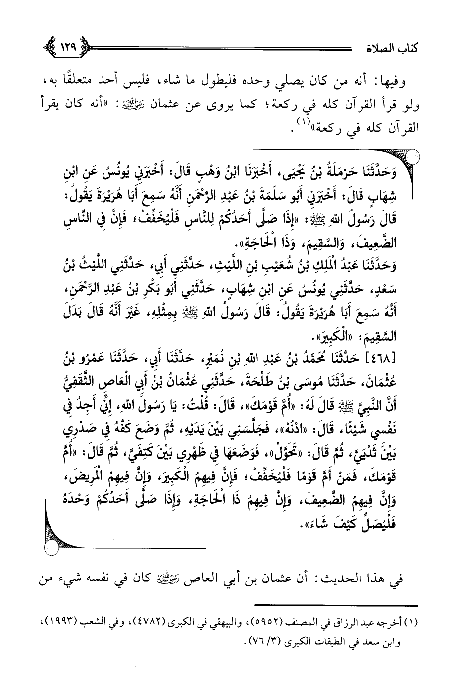 [٤٦٨] حَدَّثَنَا مُحَمَّدُ بْنُ عَبْدِ اللَّهِ بْنِ نُمَيْرٍ، حَدَّثَنَا أَبِي، حَدَّثَنَا عَمْرُو بْنُ عُثْمَانَ، حَدَّثَنَا مُوسَى بْنُ طَلْحَةَ، حَدَّثَنِي عُثْمَانُ بْنُ أَبِي الْعَاصِ الثَّقَفِيُّ أَنَّ النَّبِيَّ صلى الله عليه وسلم قَالَ لَهُ: ((أُمَّ قَوْمَكَ))، قَالَ: قُلْتُ: يَا رَسُولَ اللَّهِ، إِنِّي أَجِدُ فِي نَفْسِي شَيْئًا، قَالَ: ((ادْنُهْ))، فَجَلَّسَنِي بَيْنَ يَدَيْهِ، ثُمَّ وَضَعَ كَفَّهُ فِي صَدْرِي بَيْنَ ثَدْيَيَّ، ثُمَّ قَالَ: ((تَحَوَّلْ))، فَوَضَعَهَا فِي ظَهْرِي بَيْنَ كَتِفَيَّ، ثُمَّ قَالَ: ((أُمَّ قَوْمَكَ، فَمَنْ أَمَّ قَوْمًا فَلْيُخَفِّفْ؛ فَإِنَّ فِيهِمُ الْكَبِيرَ، وَإِنَّ فِيهِمُ الْمَرِيضَ، وَإِنَّ فِيهِمُ الضَّعِيفَ، وَإِنَّ فِيهِمُ ذَا الْحَاجَةِ، وَإِذَا صَلَّى أَحَدُكُمْ وَحْدَهُ فَلْيُصَلِّ كَيْفَ شَاءَ)).