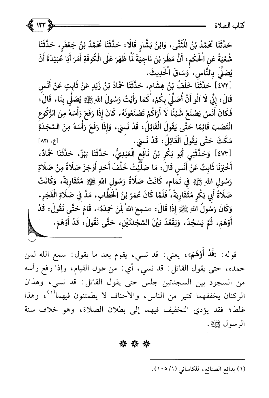 [٤٧٣] وَحَدَّثَنِي أَبُو بَكْرِ بْنُ نَافِعٍ الْعَبْدِيُّ، حَدَّثَنَا بَهْزٌ، حَدَّثَنَا حَمَّادٌ، أَخْبَرَنَا ثَابِتٌ عَنْ أَنَسٍ قَالَ: مَا صَلَّيْتُ خَلْفَ أَحَدٍ أَوْجَزَ صَلَاةً مِنْ صَلَاةِ رَسُولِ اللَّهِ صلى الله عليه وسلم فِي تَمَامٍ، كَانَتْ صَلَاةُ رَسُولِ اللَّهِ صلى الله عليه وسلم مُتَقَارِبَةً، وَكَانَتْ صَلَاةُ أَبِي بَكْرٍ مُتَقَارِبَةً، فَلَمَّا كَانَ عُمَرُ بْنُ الْخَطَّابِ، مَدَّ فِي صَلَاةِ الْفَجْرِ، وَكَانَ رَسُولُ اللَّهِ صلى الله عليه وسلم إِذَا قَالَ: ((سَمِعَ اللَّهُ لِمَنْ حَمِدَهُ))، قَامَ حَتَّى نَقُولَ: قَدْ أَوْهَمَ، ثُمَّ يَسْجُدُ، وَيَقْعُدُ بَيْنَ السَّجْدَتَيْنِ، حَتَّى نَقُولَ: قَدْ أَوْهَمَ.
