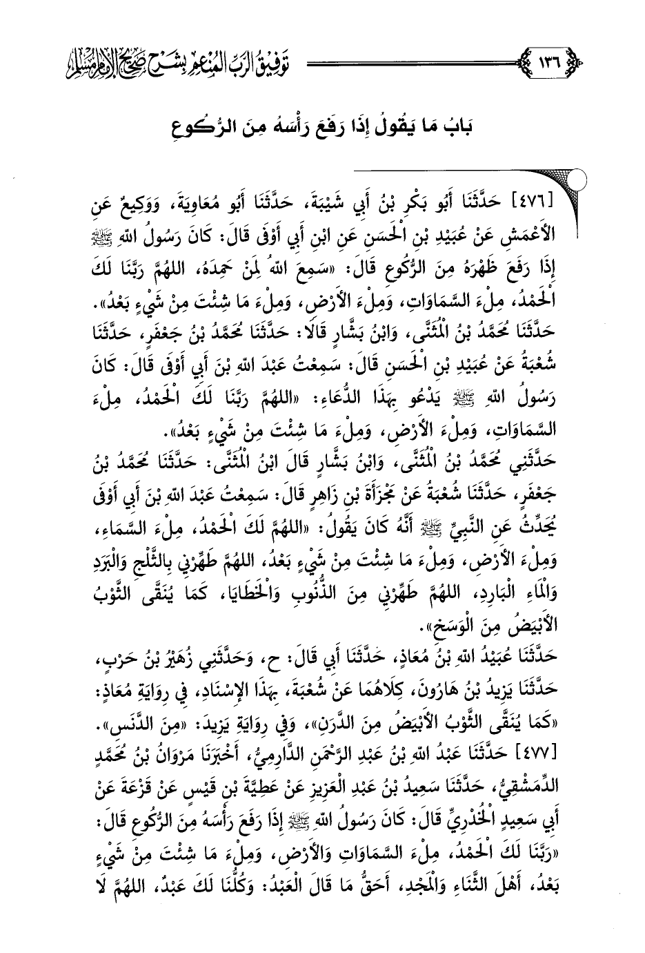 [٤٧٦] حَدَّثَنَا أَبُو بَكْرِ بْنُ أَبِي شَيْبَةَ، حَدَّثَنَا أَبُو مُعَاوِيَةَ، وَوَكِيعٌ عَنِ الأَعْمَشِ عَنْ عُبَيْدِ بْنِ الْحَسَنِ عَنِ ابْنِ أَبِي أَوْفَى قَالَ: كَانَ رَسُولُ اللَّهِ صلى الله عليه وسلم إِذَا رَفَعَ ظَهْرَهُ مِنَ الرُّكُوعِ قَالَ: ((سَمِعَ اللَّهُ لِمَنْ حَمِدَهُ، اللَّهُمَّ رَبَّنَا لَكَ الْحَمْدُ، مِلْءَ السَّمَاوَاتِ، وَمِلْءَ الأَرْضِ، وَمِلْءَ مَا شِئْتَ مِنْ شَيْءٍ بَعْدُ)).