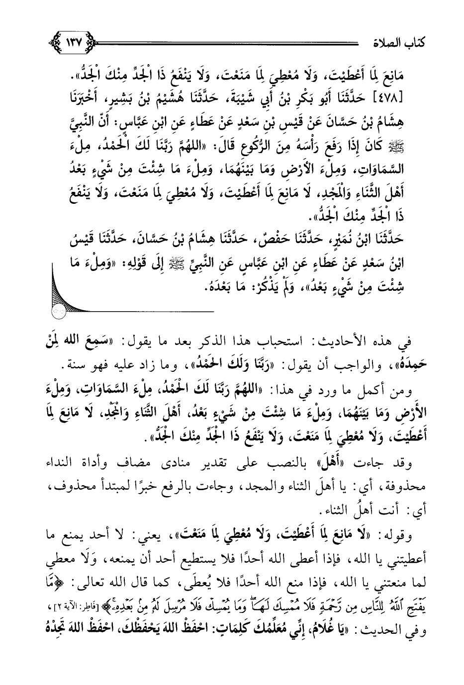 [٤٧٨] حَدَّثَنَا أَبُو بَكْرِ بْنُ أَبِي شَيْبَةَ، حَدَّثَنَا هُشَيْمُ بْنُ بَشِيرٍ، أَخْبَرَنَا هِشَامُ بْنُ حَسَّانَ عَنْ قَيْسِ بْنِ سَعْدٍ عَنْ عَطَاءٍ عَنِ ابْنِ عَبَّاسٍ: أَنّ النَّبِيَّ صلى الله عليه وسلم كَانَ إِذَا رَفَعَ رَأْسَهُ مِنَ الرُّكُوعِ قَالَ: ((اللَّهُمَّ رَبَّنَا لَكَ الْحَمْدُ، مِلْءَ السَّمَاوَاتِ، وَمِلْءَ الأَرْضِ وَمَا بَيْنَهُمَا، وَمِلْءَ مَا شِئْتَ مِنْ شَيْءٍ بَعْدُ أَهْلَ الثَّنَاءِ وَالْمَجْدِ، لَا مَانِعَ لِمَا أَعْطَيْتَ، وَلَا مُعْطِيَ لِمَا مَنَعْتَ، وَلَا يَنْفَعُ ذَا الْجَدِّ مِنْكَ الْجَدُّ)).