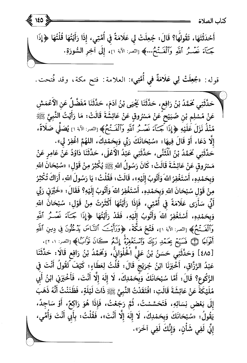 حَدَّثَنِي مُحَمَّدُ بْنُ الْمُثَنَّى، حَدَّثَنِي عَبْدُ الأَعْلَى، حَدَّثَنَا دَاوُدُ عَنْ عَامِرٍ عَنْ مَسْرُوقٍ عَنْ عَائِشَةَ قَالَتْ: كَانَ رَسُولُ اللَّهِ صلى الله عليه وسلم يُكْثِرُ مِنْ قَوْلِ: ((سُبْحَانَ اللَّهِ وَبِحَمْدِهِ، أَسْتَغْفِرُ اللَّهَ وَأَتُوبُ إِلَيْهِ))، قَالَتْ: فَقُلْتُ: يَا رَسُولَ اللَّهِ، أَرَاكَ تُكْثِرُ مِنْ قَوْلِ سُبْحَانَ اللَّهِ وَبِحَمْدِهِ، أَسْتَغْفِرُ اللَّهَ وَأَتُوبُ إِلَيْهِ؟ فَقَالَ: ((خَبَّرَنِي رَبِّي أَنِّي سَأَرَى عَلَامَةً فِي أُمَّتِي، فَإِذَا رَأَيْتُهَا أَكْثَرْتُ مِنْ قَوْلِ: سُبْحَانَ اللَّهِ وَبِحَمْدِهِ، أَسْتَغْفِرُ اللَّهَ وَأَتُوبُ إِلَيْهِ، فَقَدْ رَأَيْتُهَا {إِذَا جَاءَ نَصْرُ اللَّهِ وَالْفَتْحُ}، فَتْحُ مَكَّةَ، {وَرَأَيْتَ النَّاسَ يَدْخُلُونَ فِي دِينِ اللَّهِ أَفْوَاجًا فَسَبِّحْ بِحَمْدِ رَبِّكَ وَاسْتَغْفِرْهُ إِنَّهُ كَانَ تَوَّابًا} ((.