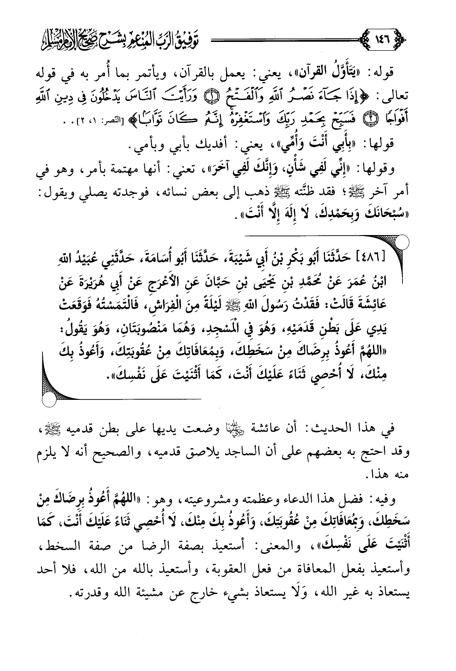 [٤٨٦] حَدَّثَنَا أَبُو بَكْرِ بْنُ أَبِي شَيْبَةَ، حَدَّثَنَا أَبُو أُسَامَةَ، حَدَّثَنِي عُبَيْدُ اللَّهِ بْنُ عُمَرَ عَنْ مُحَمَّدِ بْنِ يَحْيَى بْنِ حَبَّانَ عَنِ الأَعْرَجِ عَنْ أَبِي هُرَيْرَةَ عَنْ عَائِشَةَ قَالَتْ: فَقَدْتُ رَسُولَ اللَّهِ صلى الله عليه وسلم لَيْلَةً مِنَ الْفِرَاشِ، فَالْتَمَسْتُهُ فَوَقَعَتْ يَدِي عَلَى بَطْنِ قَدَمَيْهِ، وَهُوَ فِي الْمَسْجِدِ، وَهُمَا مَنْصُوبَتَانِ، وَهُوَ يَقُولُ: ((اللَّهُمَّ أَعُوذُ بِرِضَاكَ مِنْ سَخَطِكَ، وَبِمُعَافَاتِكَ مِنْ عُقُوبَتِكَ، وَأَعُوذُ بِكَ مِنْكَ، لَا أُحْصِي ثَنَاءً عَلَيْكَ أَنْتَ، كَمَا أَثْنَيْتَ عَلَى نَفْسِكَ)).