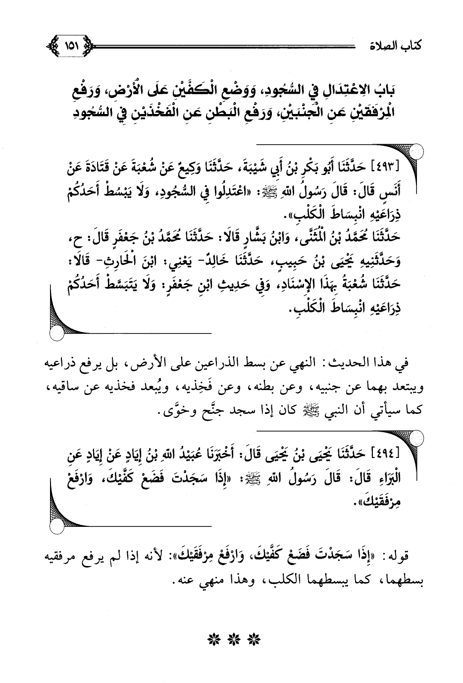 [٤٩٣] حَدَّثَنَا أَبُو بَكْرِ بْنُ أَبِي شَيْبَةَ، حَدَّثَنَا وَكِيعٌ عَنْ شُعْبَةَ عَنْ قَتَادَةَ عَنْ أَنَسٍ قَالَ: قَالَ رَسُولُ اللَّهِ صلى الله عليه وسلم: ((اعْتَدِلُوا فِي السُّجُودِ، وَلَا يَبْسُطْ أَحَدُكُمْ ذِرَاعَيْهِ انْبِسَاطَ الْكَلْبِ)).