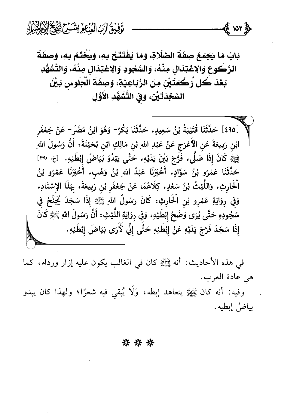 [٤٩٥] حَدَّثَنَا قُتَيْبَةُ بْنُ سَعِيدٍ، حَدَّثَنَا بَكْرٌ- وَهُوَ ابْنُ مُضَرَ- عَنْ جَعْفَرِ بْنِ رَبِيعَةَ عَنْ الأَعْرَجِ عَنْ عَبْدِ اللَّهِ بْنِ مَالِكٍ ابْنِ بُحَيْنَةَ: أَنَّ رَسُولَ اللَّهِ صلى الله عليه وسلم كَانَ إِذَا صَلَّى، فَرَّجَ بَيْنَ يَدَيْهِ، حَتَّى يَبْدُوَ بَيَاضُ إِبْطَيْهِ.