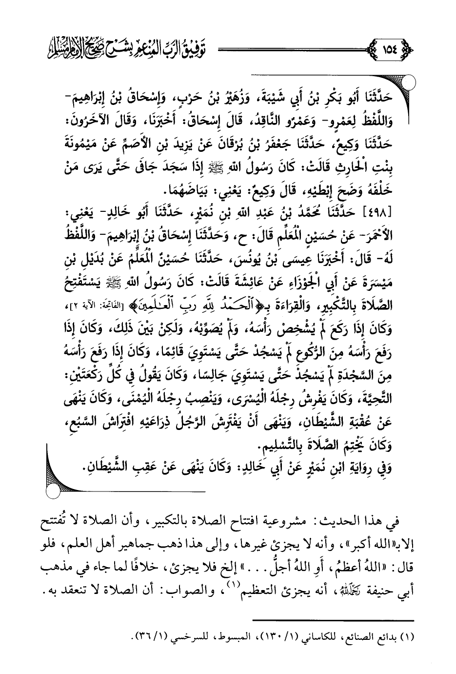 [٤٩٨] حَدَّثَنَا مُحَمَّدُ بْنُ عَبْدِ اللَّهِ بْنِ نُمَيْرٍ، حَدَّثَنَا أَبُو خَالِدٍ- يَعْنِي: الأَحْمَرَ- عَنْ حُسَيْنٍ الْمُعَلِّمِ قَالَ: ح، وَحَدَّثَنَا إِسْحَاقُ بْنُ إِبْرَاهِيمَ- وَاللَّفْظُ لَهُ- قَالَ: أَخْبَرَنَا عِيسَى بْنُ يُونُسَ، حَدَّثَنَا حُسَيْنٌ الْمُعَلِّمُ عَنْ بُدَيْلِ بْنِ مَيْسَرَةَ عَنْ أَبِي الْجَوْزَاءِ عَنْ عَائِشَةَ قَالَتْ: كَانَ رَسُولُ اللَّهِ صلى الله عليه وسلم يَسْتَفْتِحُ الصَّلَاةَ بِالتَّكْبِيرِ، وَالْقِرَاءَةَ بِـ {الْحَمْدُ لِلَّهِ رَبِّ الْعَالَمِينَ}، وَكَانَ إِذَا رَكَعَ لَمْ يُشْخِصْ رَأْسَهُ، وَلَمْ يُصَوِّبْهُ، وَلَكِنْ بَيْنَ ذَلِكَ، وَكَانَ إِذَا رَفَعَ رَأْسَهُ مِنَ الرُّكُوعِ لَمْ يَسْجُدْ حَتَّى يَسْتَوِيَ قَائِمًا، وَكَانَ إِذَا رَفَعَ رَأْسَهُ مِنَ السَّجْدَةِ لَمْ يَسْجُدْ حَتَّى يَسْتَوِيَ جَالِسًا، وَكَانَ يَقُولُ فِي كُلِّ رَكْعَتَيْنِ: التَّحِيَّةَ، وَكَانَ يَفْرِشُ رِجْلَهُ الْيُسْرَى، وَيَنْصِبُ رِجْلَهُ الْيُمْنَى، وَكَانَ يَنْهَى عَنْ عُقْبَةِ الشَّيْطَانِ، وَيَنْهَى أَنْ يَفْتَرِشَ الرَّجُلُ ذِرَاعَيْهِ افْتِرَاشَ السَّبُعِ، وَكَانَ يَخْتِمُ الصَّلَاةَ بِالتَّسْلِيمِ.