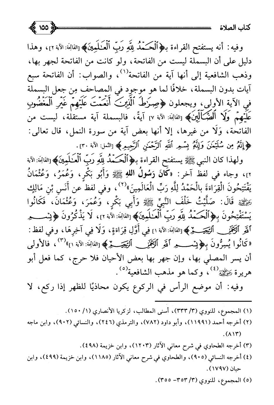 وفيه: أنه يستفتح القراءة بـ {الحمد لله رب العالمين}، وهذا دليل على أن البسملة ليست من الفاتحة، ولو كانت من الفاتحة لجهر بها، وذهب الشافعية إلى أنها آية من الفاتحة (¬١)، والصواب: أن الفاتحة سبع آيات بدون البسملة، خلافًا لما هو موجود في المصاحف مِن جعل البسملة في الآية الأولى، ويجعلون {صراط الذين أنعمت عليهم غير المغضوب عليهم وَلَا الضالين} آيةً، فالبسملة آية مستقلة، ليست من الفاتحة، وَلَا من غيرها، إلا أنها بعض آية من سورة النمل، قال تعالى: {إنه من سليمان وإنه بسم الله الرحيم الرحيم}.