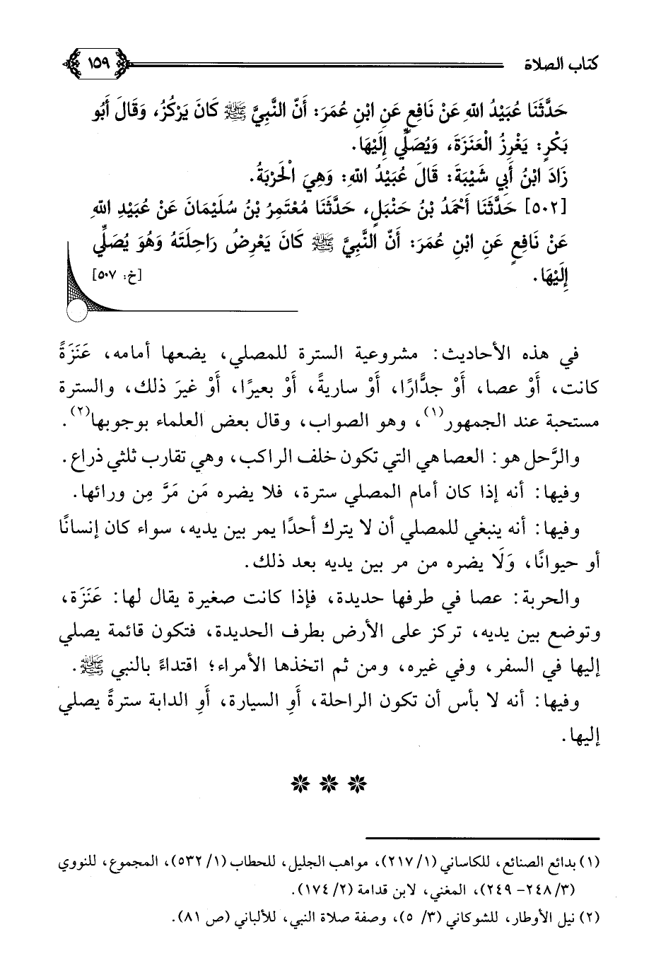 [٥٠٢] حَدَّثَنَا أَحْمَدُ بْنُ حَنْبَلٍ، حَدَّثَنَا مُعْتَمِرُ بْنُ سُلَيْمَانَ عَنْ عُبَيْدِ اللَّهِ عَنْ نَافِعٍ عَنِ ابْنِ عُمَرَ: أَنّ النَّبِيَّ صلى الله عليه وسلم كَانَ يَعْرِضُ رَاحِلَتَهُ وَهُوَ يُصَلِّي إِلَيْهَا.