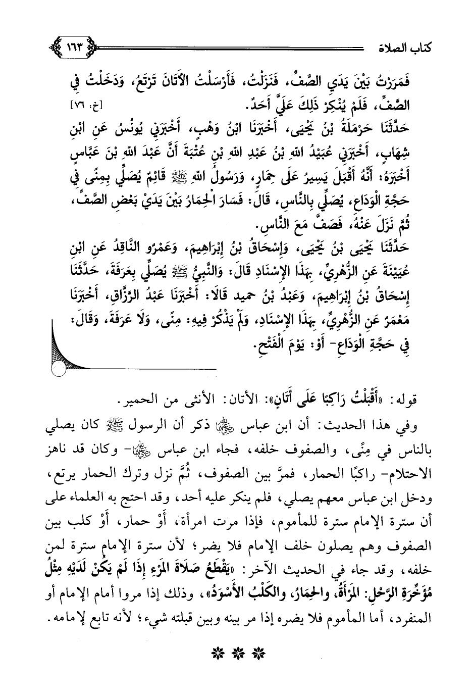 حَدَّثَنَا حَرْمَلَةُ بْنُ يَحْيَى، أَخْبَرَنَا ابْنُ وَهْبٍ، أَخْبَرَنِي يُونُسُ عَنِ ابْنِ شِهَابٍ، أَخْبَرَنِي عُبَيْدُ اللَّهِ بْنُ عَبْدِ اللَّهِ بْنِ عُتْبَةَ أَنَّ عَبْدَ اللَّهِ بْنَ عَبَّاسٍ أَخْبَرَهُ: أَنَّهُ أَقْبَلَ يَسِيرُ عَلَى حِمَارٍ، وَرَسُولُ اللَّهِ صلى الله عليه وسلم قَائِمٌ يُصَلِّي بِمِنًى فِي حَجَّةِ الْوَدَاعِ، يُصَلِّي بِالنَّاسِ، قَالَ: فَسَارَ الْحِمَارُ بَيْنَ يَدَيْ بَعْضِ الصَّفِّ، ثُمَّ نَزَلَ عَنْهُ، فَصَفَّ مَعَ النَّاسِ.