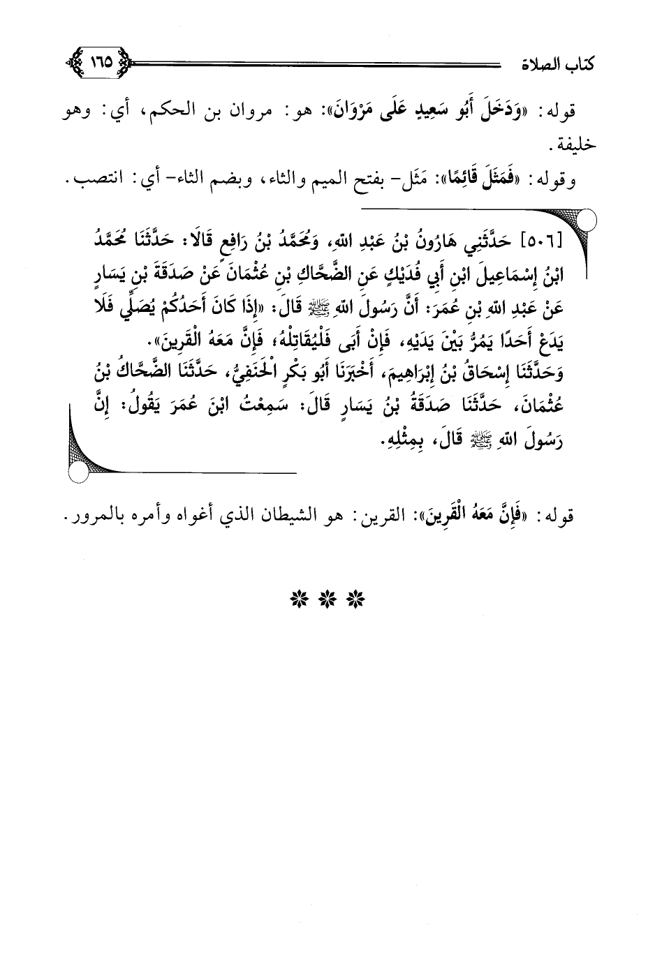 [٥٠٦] حَدَّثَنِي هَارُونُ بْنُ عَبْدِ اللَّهِ، وَمُحَمَّدُ بْنُ رَافِعٍ قَالَا: حَدَّثَنَا مُحَمَّدُ بْنُ إِسْمَاعِيلَ ابْنِ أَبِي فُدَيْكٍ عَنِ الضَّحَّاكِ بْنِ عُثْمَانَ عَنْ صَدَقَةَ بْنِ يَسَارٍ عَنْ عَبْدِ اللَّهِ بْنِ عُمَرَ: أَن رَسُولَ اللَّهِ صلى الله عليه وسلم قَالَ: ((إِذَا كَانَ أَحَدُكُمْ يُصَلِّي فَلَا يَدَعْ أَحَدًا يَمُرُّ بَيْنَ يَدَيْهِ، فَإِنْ أَبَى فَلْيُقَاتِلْهُ؛ فَإِنَّ مَعَهُ الْقَرِينَ)).
