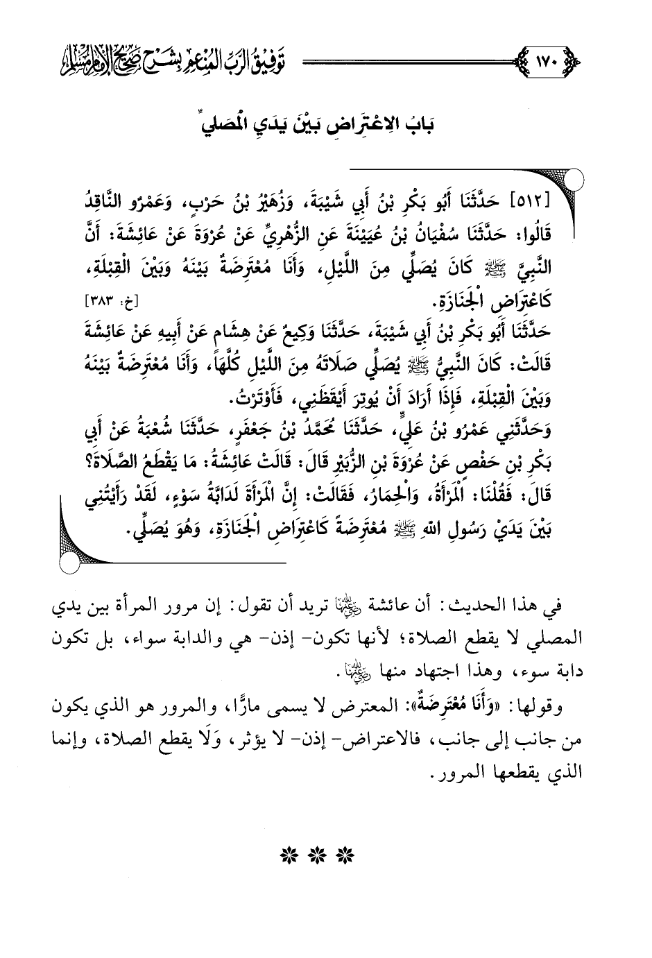[٥١٢] حَدَّثَنَا أَبُو بَكْرِ بْنُ أَبِي شَيْبَةَ، وَزُهَيْرُ بْنُ حَرْبٍ، وَعَمْرٌو النَّاقِدُ قَالُوا: حَدَّثَنَا سُفْيَانُ بْنُ عُيَيْنَةَ عَنِ الزُّهْرِيِّ عَنْ عُرْوَةَ عَنْ عَائِشَةَ: أَنَّ النَّبِيَّ صلى الله عليه وسلم كَانَ يُصَلِّي مِنَ اللَّيْلِ، وَأَنَا مُعْتَرِضَةٌ بَيْنَهُ وَبَيْنَ الْقِبْلَةِ، كَاعْتِرَاضِ الْجَنَازَةِ.