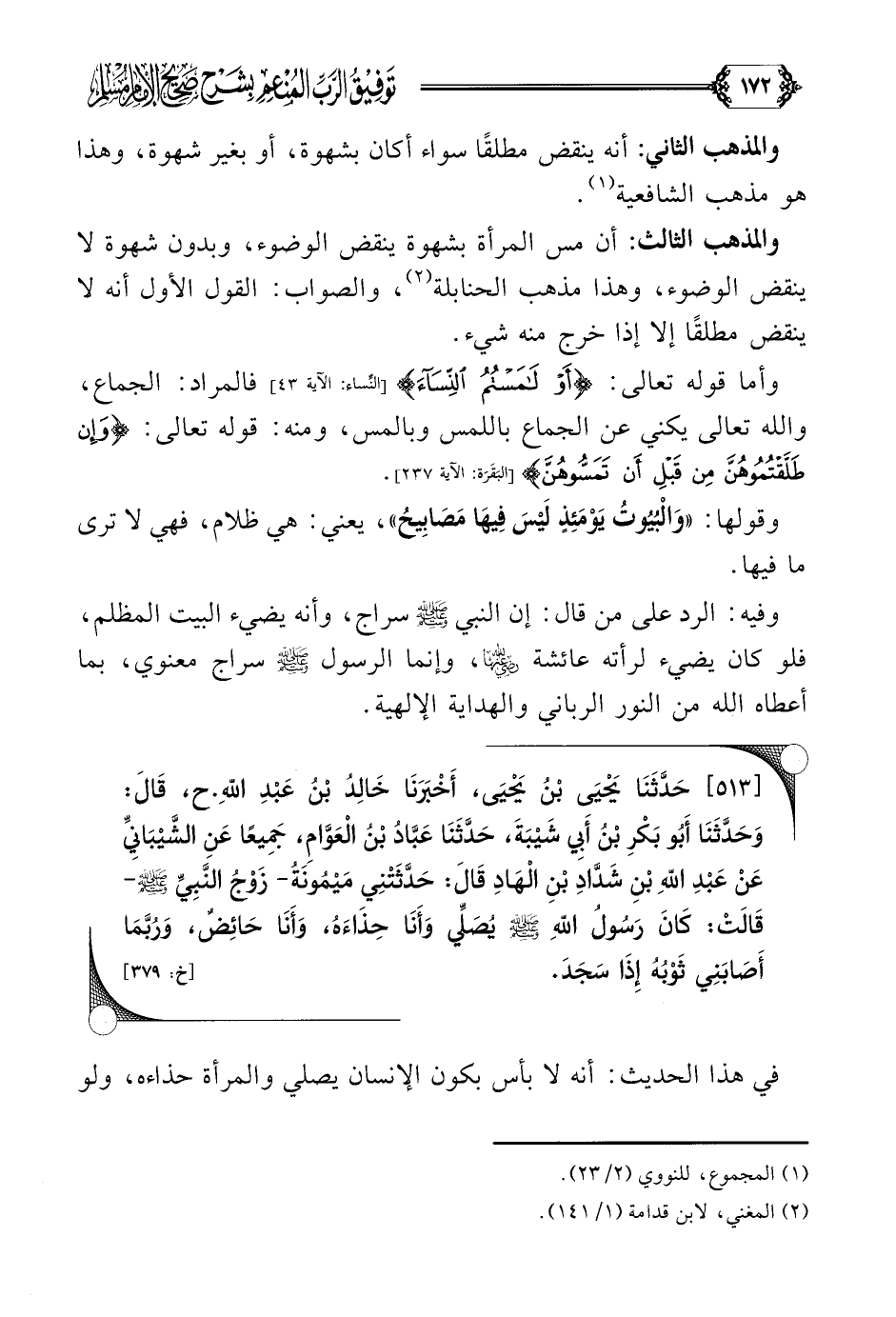والمذهب الثالث: أن مس المرأة بشهوة ينقض الوضوء، وبدون شهوة لا ينقض الوضوء، وهذا مذهب الحنابلة (¬٢)، والصواب: القول الأول أنه لا ينقض مطلقًا إلا إذا خرج منه شيء.