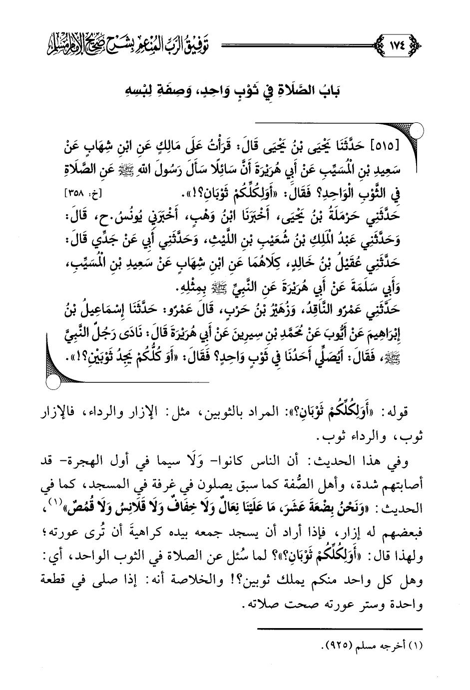[٥١٥] حَدَّثَنَا يَحْيَى بْنُ يَحْيَى قَالَ: قَرَأْتُ عَلَى مَالِكٍ عَنِ ابْنِ شِهَابٍ عَنْ سَعِيدِ بْنِ الْمُسَيِّبِ عَنْ أَبِي هُرَيْرَةَ أَنَّ سَائِلًا سَأَلَ رَسُولَ اللَّهِ صلى الله عليه وسلم عَنِ الصَّلَاةِ فِي الثَّوْبِ الْوَاحِدِ؟ فَقَالَ: ((أَوَلِكُلِّكُمْ ثَوْبَانِ؟ ! )).