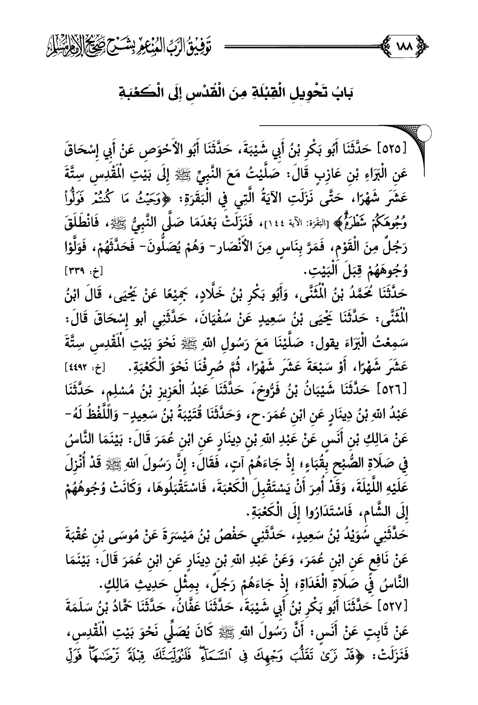 [٥٢٥] حَدَّثَنَا أَبُو بَكْرِ بْنُ أَبِي شَيْبَةَ، حَدَّثَنَا أَبُو الأَحْوَصِ عَنْ أَبِي إِسْحَاقَ عَنِ الْبَرَاءِ بْنِ عَازِبٍ قَالَ: صَلَّيْتُ مَعَ النَّبِيِّ صلى الله عليه وسلم إِلَى بَيْتِ الْمَقْدِسِ سِتَّةَ عَشَرَ شَهْرًا، حَتَّى نَزَلَتِ الآيَةُ الَّتِي فِي الْبَقَرَةِ: {وَحَيْثُ مَا كُنْتُمْ فَوَلُّوا وُجُوهَكُمْ شَطْرَهُ}، فَنَزَلَتْ بَعْدَمَا صَلَّى النَّبِيُّ صلى الله عليه وسلم، فَانْطَلَقَ رَجُلٌ مِنَ الْقَوْمِ، فَمَرَّ بِنَاسٍ مِنَ الأَنْصَار- وَهُمْ يُصَلُّونَ- فَحَدَّثَهُمْ، فَوَلَّوْا وُجُوهَهُمْ قِبَلَ الْبَيْتِ.