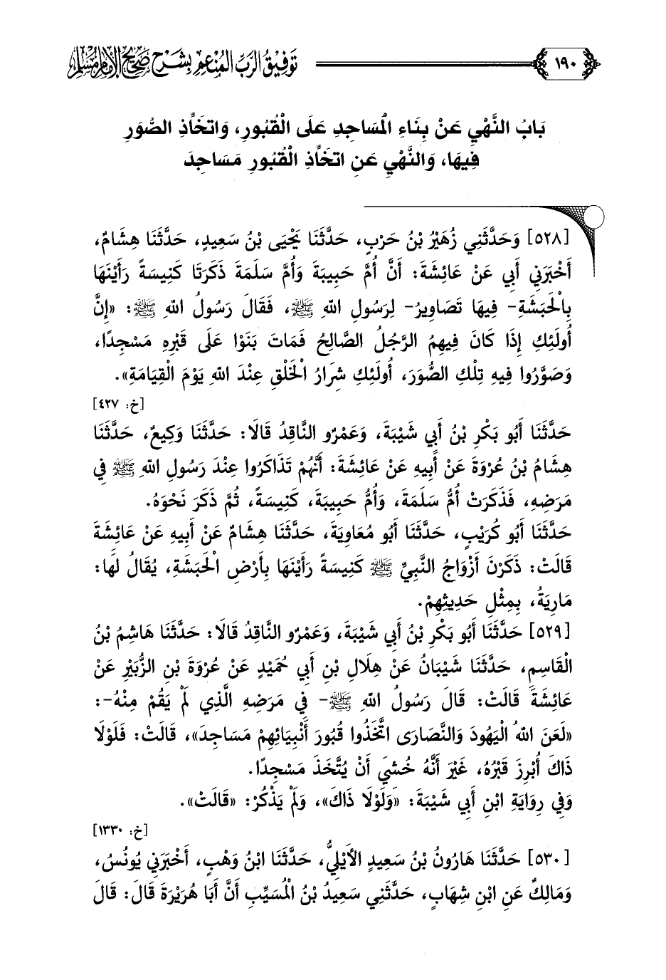 [٥٢٨] وَحَدَّثَنِي زُهَيْرُ بْنُ حَرْبٍ، حَدَّثَنَا يَحْيَى بْنُ سَعِيدٍ، حَدَّثَنَا هِشَامٌ، أَخْبَرَنِي أَبِي عَنْ عَائِشَةَ: أَنَّ أُمَّ حَبِيبَةَ وَأُمَّ سَلَمَةَ ذَكَرَتَا كَنِيسَةً رَأَيْنَهَا بِالْحَبَشَةِ- فِيهَا تَصَاوِيرُ- لِرَسُولِ اللَّهِ صلى الله عليه وسلم، فَقَالَ رَسُولُ اللَّهِ صلى الله عليه وسلم: ((إِنَّ أُولَئِكِ إِذَا كَانَ فِيهِمُ الرَّجُلُ الصَّالِحُ فَمَاتَ بَنَوْا عَلَى قَبْرِهِ مَسْجِدًا، وَصَوَّرُوا فِيهِ تِلْكِ الصُّوَرَ، أُولَئِكِ شِرَارُ الْخَلْقِ عِنْدَ اللَّهِ يَوْمَ الْقِيَامَةِ)).