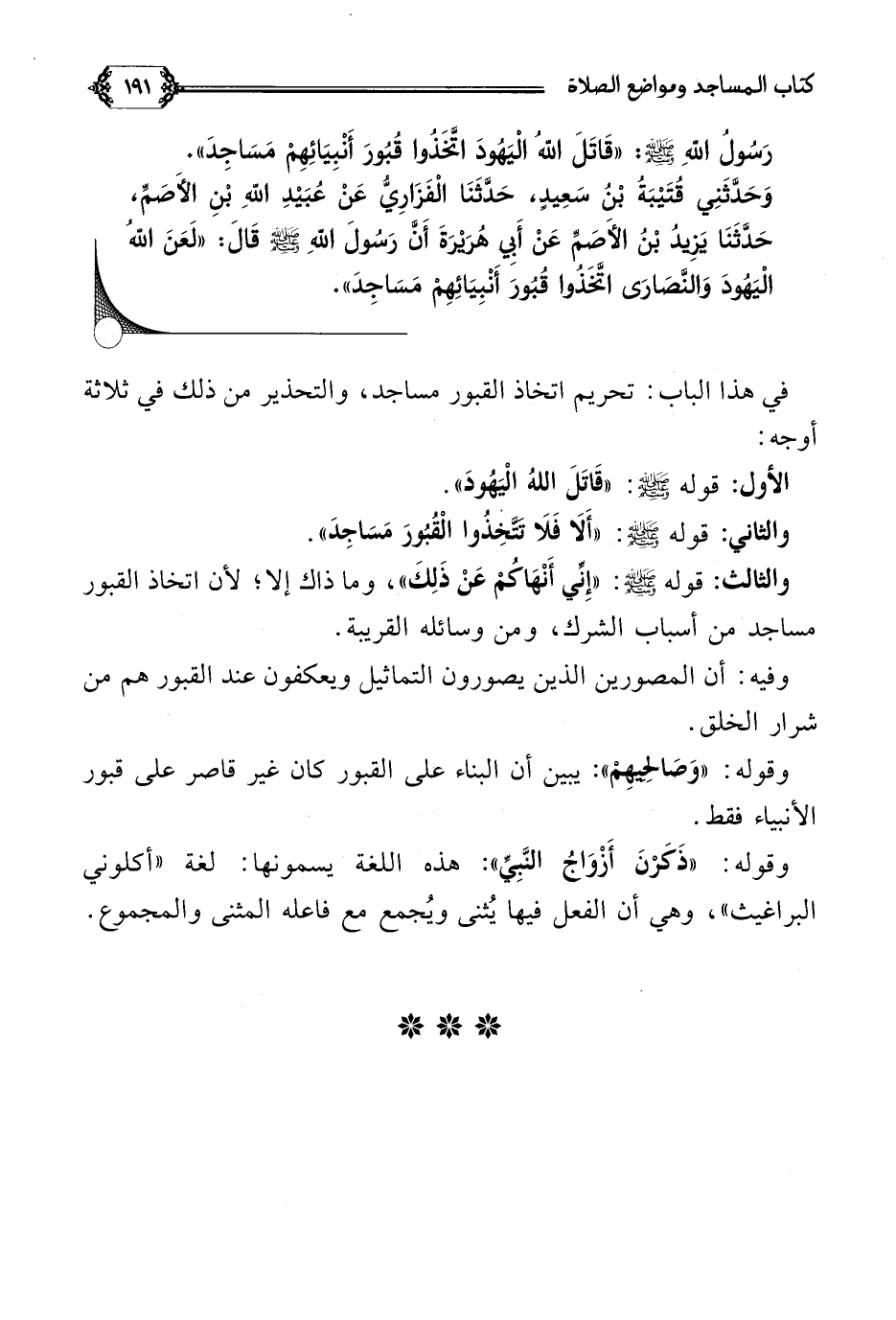 رَسُولُ اللَّهِ صلى الله عليه وسلم: ((قَاتَلَ اللَّهُ الْيَهُودَ اتَّخَذُوا قُبُورَ أَنْبِيَائِهِمْ مَسَاجِدَ)).