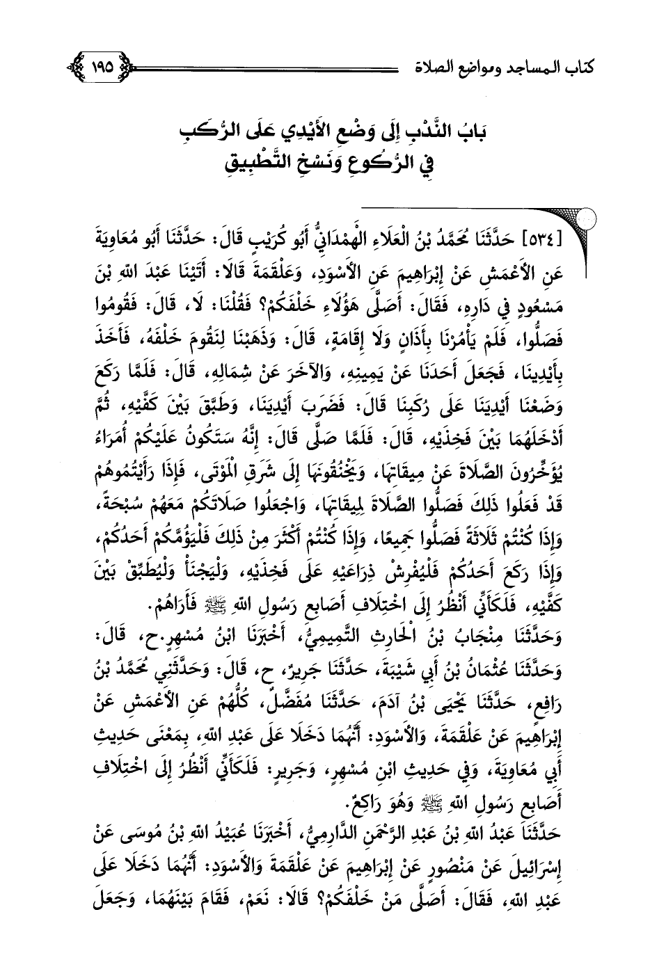 [٥٣٤] حَدَّثَنَا مُحَمَّدُ بْنُ الْعَلَاءِ الْهَمْدَانِيُّ أَبُو كُرَيْبٍ قَالَ: حَدَّثَنَا أَبُو مُعَاوِيَةَ عَنِ الأَعْمَشِ عَنْ إِبْرَاهِيمَ عَنِ الأَسْوَدِ، وَعَلْقَمَةَ قَالَا: أَتَيْنَا عَبْدَ اللَّهِ بْنَ مَسْعُودٍ فِي دَارِهِ، فَقَالَ: أَصَلَّى هَؤُلَاءِ خَلْفَكُمْ؟ فَقُلْنَا: لَا، قَالَ: فَقُومُوا فَصَلُّوا، فَلَمْ يَأْمُرْنَا بِأَذَانٍ وَلَا إِقَامَةٍ، قَالَ: وَذَهَبْنَا لِنَقُومَ خَلْفَهُ، فَأَخَذَ بِأَيْدِينَا، فَجَعَلَ أَحَدَنَا عَنْ يَمِينِهِ، وَالآخَرَ عَنْ شِمَالِهِ، قَالَ: فَلَمَّا رَكَعَ وَضَعْنَا أَيْدِيَنَا عَلَى رُكَبِنَا قَالَ: فَضَرَبَ أَيْدِيَنَا، وَطَبَّقَ بَيْنَ كَفَّيْهِ، ثُمَّ أَدْخَلَهُمَا بَيْنَ فَخِذَيْهِ، قَالَ: فَلَمَّا صَلَّى قَالَ: إِنَّهُ سَتَكُونُ عَلَيْكُمْ أُمَرَاءُ يُؤَخِّرُونَ الصَّلَاةَ عَنْ مِيقَاتِهَا، وَيَخْنُقُونَهَا إِلَى شَرَقِ الْمَوْتَى، فَإِذَا رَأَيْتُمُوهُمْ قَدْ فَعَلُوا ذَلِكَ فَصَلُّوا الصَّلَاةَ لِمِيقَاتِهَا، وَاجْعَلُوا صَلَاتَكُمْ مَعَهُمْ سُبْحَةً، وَإِذَا كُنْتُمْ ثَلَاثَةً فَصَلُّوا جَمِيعًا، وَإِذَا كُنْتُمْ أَكْثَرَ مِنْ ذَلِكَ فَلْيَؤُمَّكُمْ أَحَدُكُمْ، وَإِذَا رَكَعَ أَحَدُكُمْ فَلْيُفْرِشْ ذِرَاعَيْهِ عَلَى فَخِذَيْهِ، وَلْيَجْنَأْ وَلْيُطَبِّقْ بَيْنَ كَفَّيْهِ، فَلَكَأَنِّي أَنْظُرُ إِلَى اخْتِلَافِ أَصَابِعِ رَسُولِ اللَّهِ صلى الله عليه وسلم فَأَرَاهُمْ.