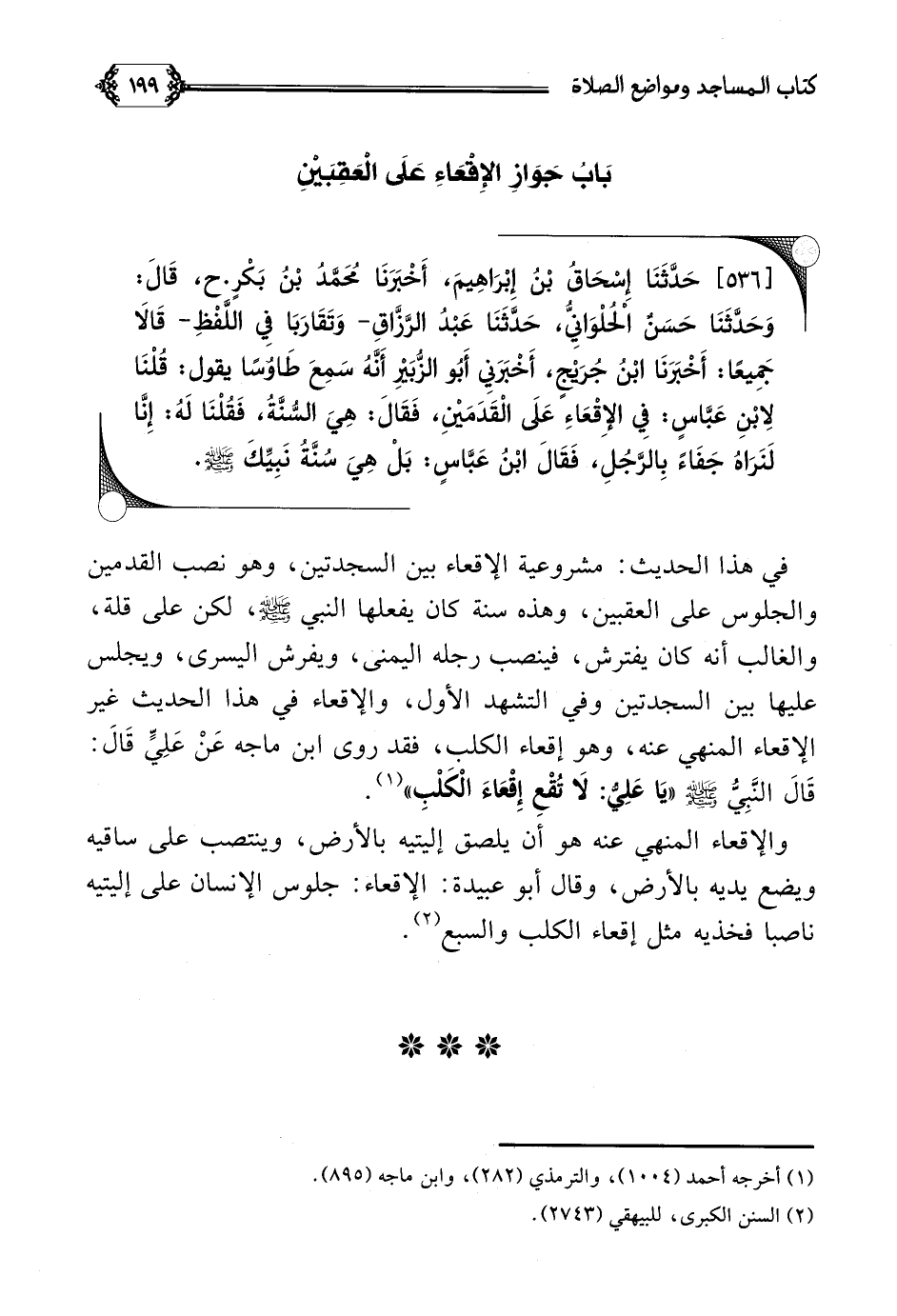 [٥٣٦] حَدَّثَنَا إِسْحَاقُ بْنُ إِبْرَاهِيمَ، أَخْبَرَنَا مُحَمَّدُ بْنُ بَكْرٍ. ح، قَالَ: وَحَدَّثَنَا حَسَنٌ الْحُلْوَانِيُّ، حَدَّثَنَا عَبْدُ الرَّزَّاقِ- وَتَقَارَبَا فِي اللَّفْظِ- قَالَا جَمِيعًا: أَخْبَرَنَا ابْنُ جُرَيْجٍ، أَخْبَرَنِي أَبُو الزُّبَيْرِ أَنَّهُ سَمِعَ طَاوُسًا يقول: قُلْنَا لِابْنِ عَبَّاسٍ: فِي الإِقْعَاءِ عَلَى الْقَدَمَيْنِ، فَقَالَ: هِيَ السُّنَّةُ، فَقُلْنَا لَهُ: إِنَّا لَنَرَاهُ جَفَاءً بِالرَّجُلِ، فَقَالَ ابْنُ عَبَّاسٍ: بَلْ هِيَ سُنَّةُ نَبِيِّكَ صلى الله عليه وسلم.