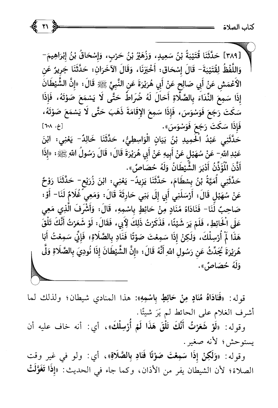 [٣٨٩] حَدَّثَنَا قُتَيْبَةُ بْنُ سَعِيدٍ، وَزُهَيْرُ بْنُ حَرْبٍ، وَإِسْحَاقُ بْنُ إِبْرَاهِيمَ- وَاللَّفْظُ لِقُتَيْبَةَ- قَالَ إِسْحَاق: أَخْبَرَنَا، وَقَالَ الآخَرَانِ: حَدَّثَنَا جَرِيرٌ عَنِ الأَعْمَشِ عَنْ أَبِي صَالِحٍ عَنْ أَبِي هُرَيْرَةَ عَنِ النَّبِيِّ صلى الله عليه وسلم قَالَ: ((إِنَّ الشَّيْطَانَ إِذَا سَمِعَ النِّدَاءَ بِالصَّلَاةِ أَحَالَ لَهُ ضُرَاطٌ حَتَّى لَا يَسْمَعَ صَوْتَهُ، فَإِذَا سَكَتَ رَجَعَ فَوَسْوَسَ، فَإِذَا سَمِعَ الإِقَامَةَ ذَهَبَ حَتَّى لَا يَسْمَعَ صَوْتَهُ، فَإِذَا سَكَتَ رَجَعَ فَوَسْوَسَ)).