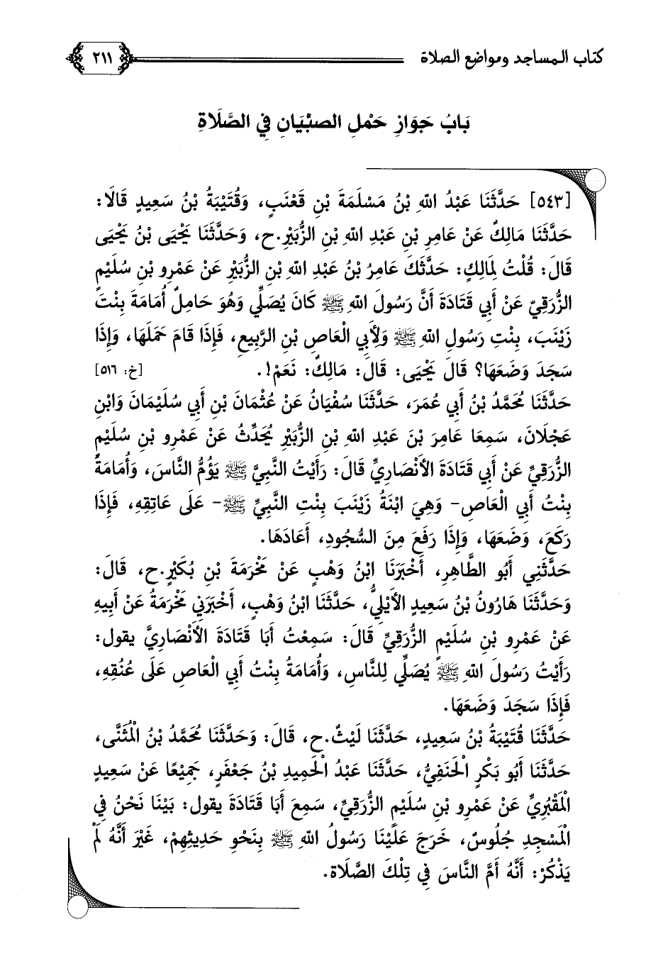 [٥٤٣] حَدَّثَنَا عَبْدُ اللَّهِ بْنُ مَسْلَمَةَ بْنِ قَعْنَبٍ، وَقُتَيْبَةُ بْنُ سَعِيدٍ قَالَا: حَدَّثَنَا مَالِكٌ عَنْ عَامِرِ بْنِ عَبْدِ اللَّهِ بْنِ الزُّبَيْرِ. ح، وَحَدَّثَنَا يَحْيَى بْنُ يَحْيَى قَالَ: قُلْتُ لِمَالِكٍ: حَدَّثَكَ عَامِرُ بْنُ عَبْدِ اللَّهِ بْنِ الزُّبَيْرِ عَنْ عَمْرِو بْنِ سُلَيْمٍ الزُّرَقِيّ عَنْ أَبِي قَتَادَةَ أَنَّ رَسُولَ اللَّهِ صلى الله عليه وسلم كَانَ يُصَلِّي وَهُوَ حَامِلٌ أُمَامَةَ بِنْتَ زَيْنَبَ، بِنْتِ رَسُولِ اللَّهِ صلى الله عليه وسلم وَلِأَبِي الْعَاصِ بْنِ الرَّبِيعِ، فَإِذَا قَامَ حَمَلَهَا، وَإِذَا سَجَدَ وَضَعَهَا؟ قَالَ يَحْيَى: قَالَ: مَالِكٌ: نَعَمْ! .