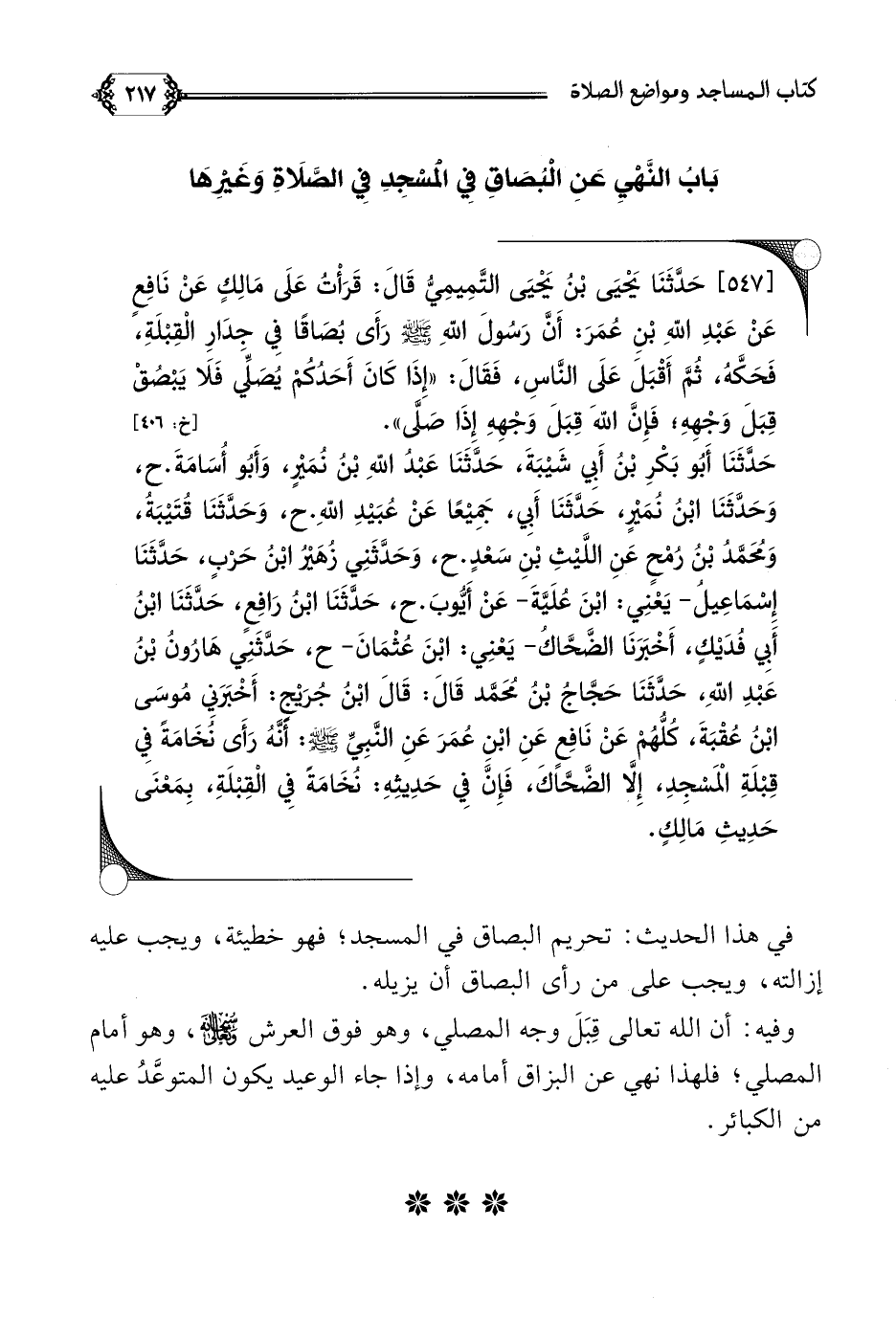 [٥٤٧] حَدَّثَنَا يَحْيَى بْنُ يَحْيَى التَّمِيمِيُّ قَالَ: قَرَأْتُ عَلَى مَالِكٍ عَنْ نَافِعٍ عَنْ عَبْدِ اللَّهِ بْنِ عُمَرَ: أَنَّ رَسُولَ اللَّهِ صلى الله عليه وسلم رَأَى بُصَاقًا فِي جِدَارِ الْقِبْلَةِ، فَحَكَّهُ، ثُمَّ أَقْبَلَ عَلَى النَّاسِ، فَقَالَ: ((إِذَا كَانَ أَحَدُكُمْ يُصَلِّي فَلَا يَبْصُقْ قِبَلَ وَجْهِهِ؛ فَإِنَّ اللَّهَ قِبَلَ وَجْهِهِ إِذَا صَلَّى)).