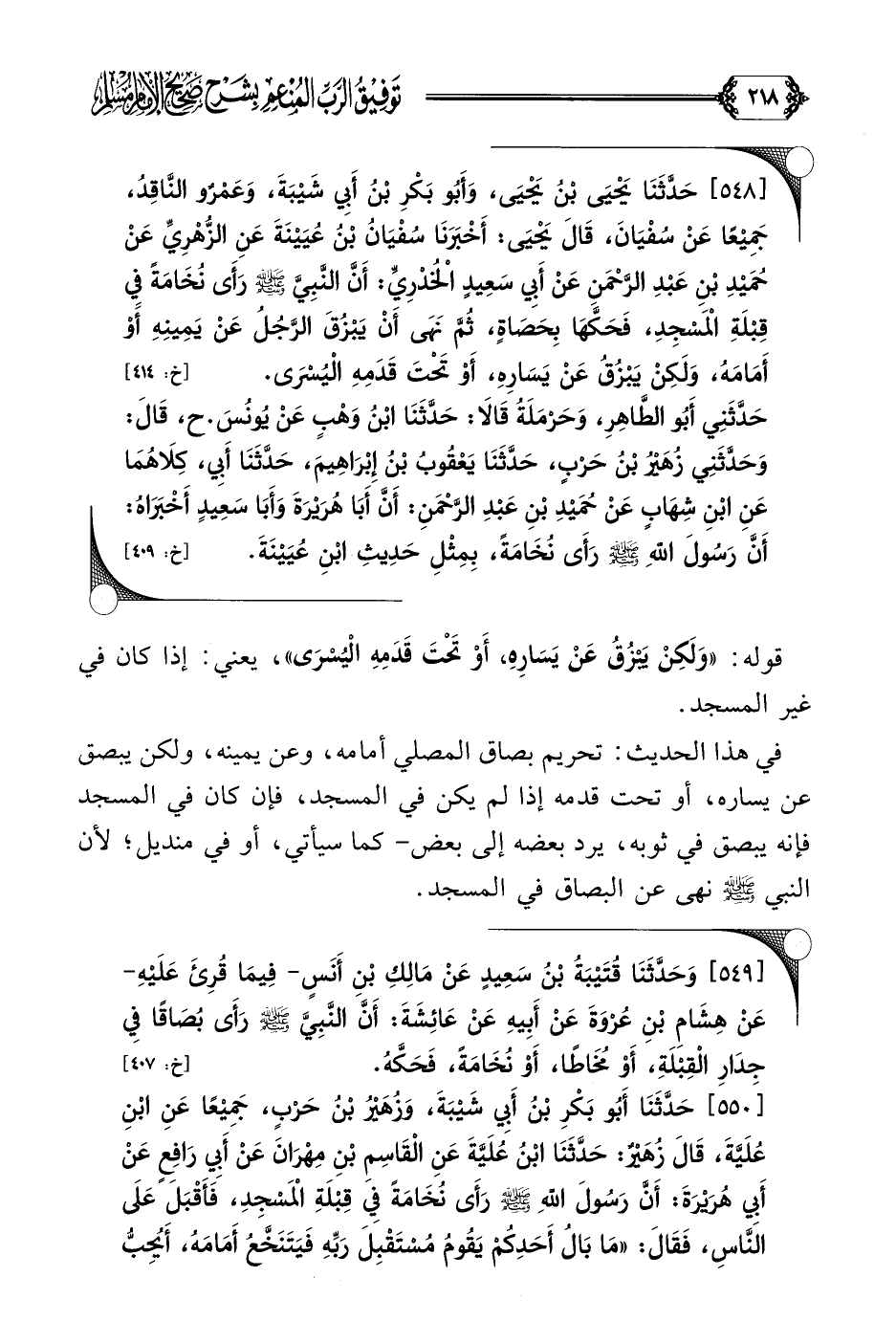 [٥٤٨] حَدَّثَنَا يَحْيَى بْنُ يَحْيَى، وَأَبُو بَكْرِ بْنُ أَبِي شَيْبَةَ، وَعَمْرٌو النَّاقِدُ، جَمِيْعًا عَنْ سُفْيَانَ، قَالَ يَحْيَى: أَخْبَرَنَا سُفْيَانُ بْنُ عُيَيْنَةَ عَنِ الزُّهْرِيِّ عَنْ حُمَيْدِ بْنِ عَبْدِ الرَّحْمَنِ عَنْ أَبِي سَعِيدٍ الْخُدْرِيِّ: أَنَّ النَّبِيَّ صلى الله عليه وسلم رَأَى نُخَامَةً فِي قِبْلَةِ الْمَسْجِدِ، فَحَكَّهَا بِحَصَاةٍ، ثُمَّ نَهَى أَنْ يَبْزُقَ الرَّجُلُ عَنْ يَمِينِهِ أَوْ أَمَامَهُ، وَلَكِنْ يَبْزُقُ عَنْ يَسَارِهِ، أَوْ تَحْتَ قَدَمِهِ الْيُسْرَى.