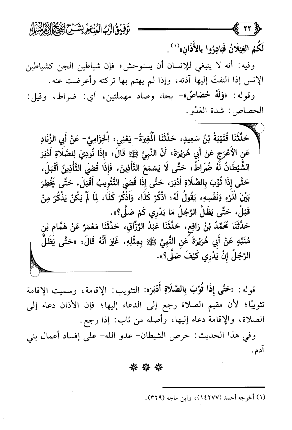 حَدَّثَنَا قُتَيْبَةُ بْنُ سَعِيدٍ، حَدَّثَنَا الْمُغِيرَةُ- يَعْنِي: الْحِزَامِيَّ- عَنْ أَبِي الزِّنَادِ عَنِ الأَعْرَجِ عَنْ أَبِي هُرَيْرَةَ: أَنّ النَّبِيَّ صلى الله عليه وسلم قَالَ: ((إِذَا نُودِيَ لِلصَّلَاةِ أَدْبَرَ الشَّيْطَانُ لَهُ ضُرَاطٌ؛ حَتَّى لَا يَسْمَعَ التَّأْذِينَ، فَإِذَا قُضِيَ التَّأْذِينُ أَقْبَلَ، حَتَّى إِذَا ثُوِّبَ بِالصَّلَاةِ أَدْبَرَ، حَتَّى إِذَا قُضِيَ التَّثْوِيبُ أَقْبَلَ، حَتَّى يَخْطِرَ بَيْنَ الْمَرْءِ وَنَفْسِهِ، يَقُولُ لَهُ: اذْكُرْ كَذَا، وَاذْكُرْ كَذَا، لِمَا لَمْ يَكُنْ يَذْكُرُ مِنْ قَبْلُ، حَتَّى يَظَلَّ الرَّجُلُ مَا يَدْرِي كَمْ صَلَّى؟ )).
