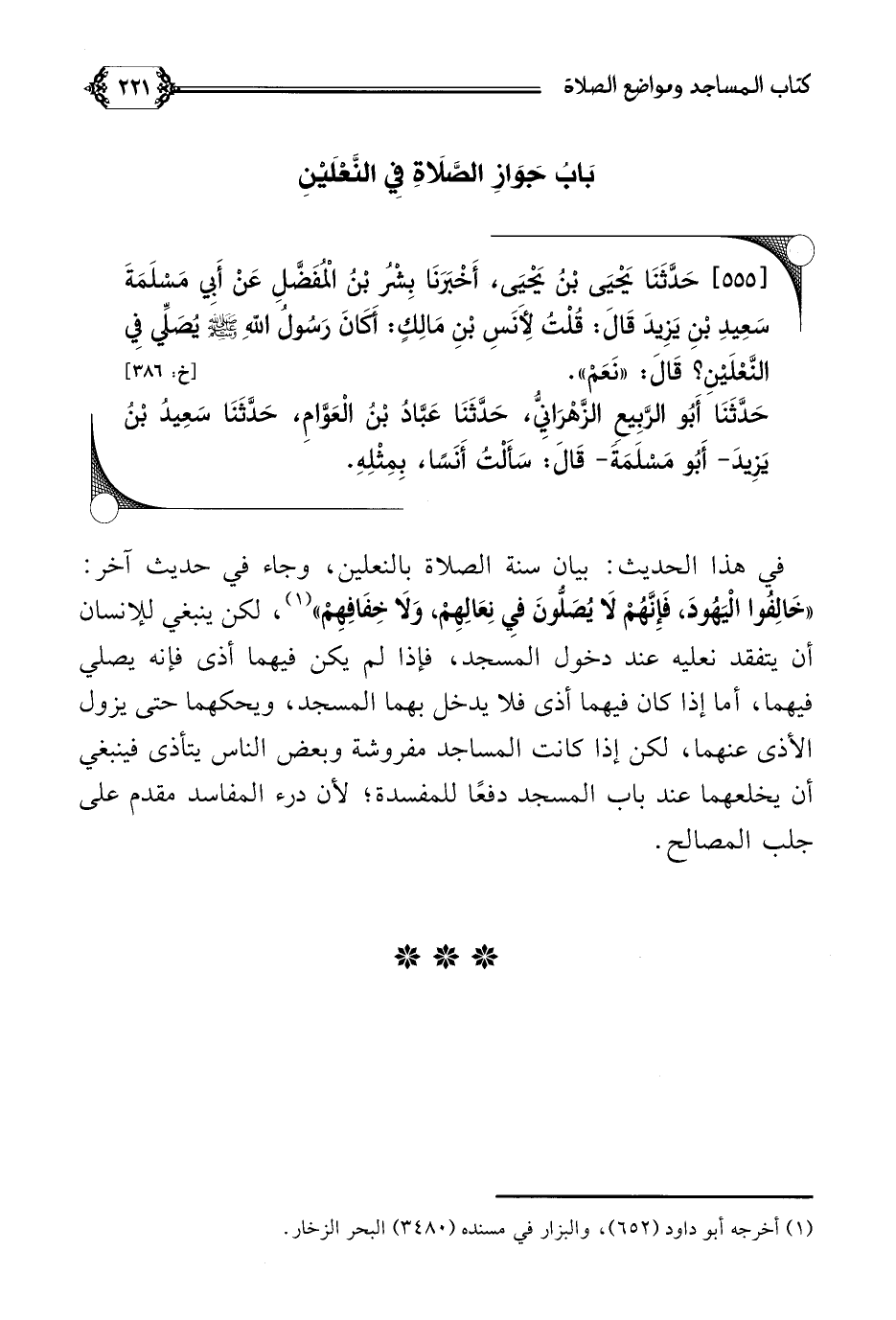 [٥٥٥] حَدَّثَنَا يَحْيَى بْنُ يَحْيَى، أَخْبَرَنَا بِشْرُ بْنُ الْمُفَضَّلِ عَنْ أَبِي مَسْلَمَةَ سَعِيدِ بْنِ يَزِيدَ قَالَ: قُلْتُ لِأَنَسِ بْنِ مَالِكٍ: أَكَانَ رَسُولُ اللَّهِ صلى الله عليه وسلم يُصَلِّي فِي النَّعْلَيْنِ؟ قَالَ: ((نَعَمْ)).