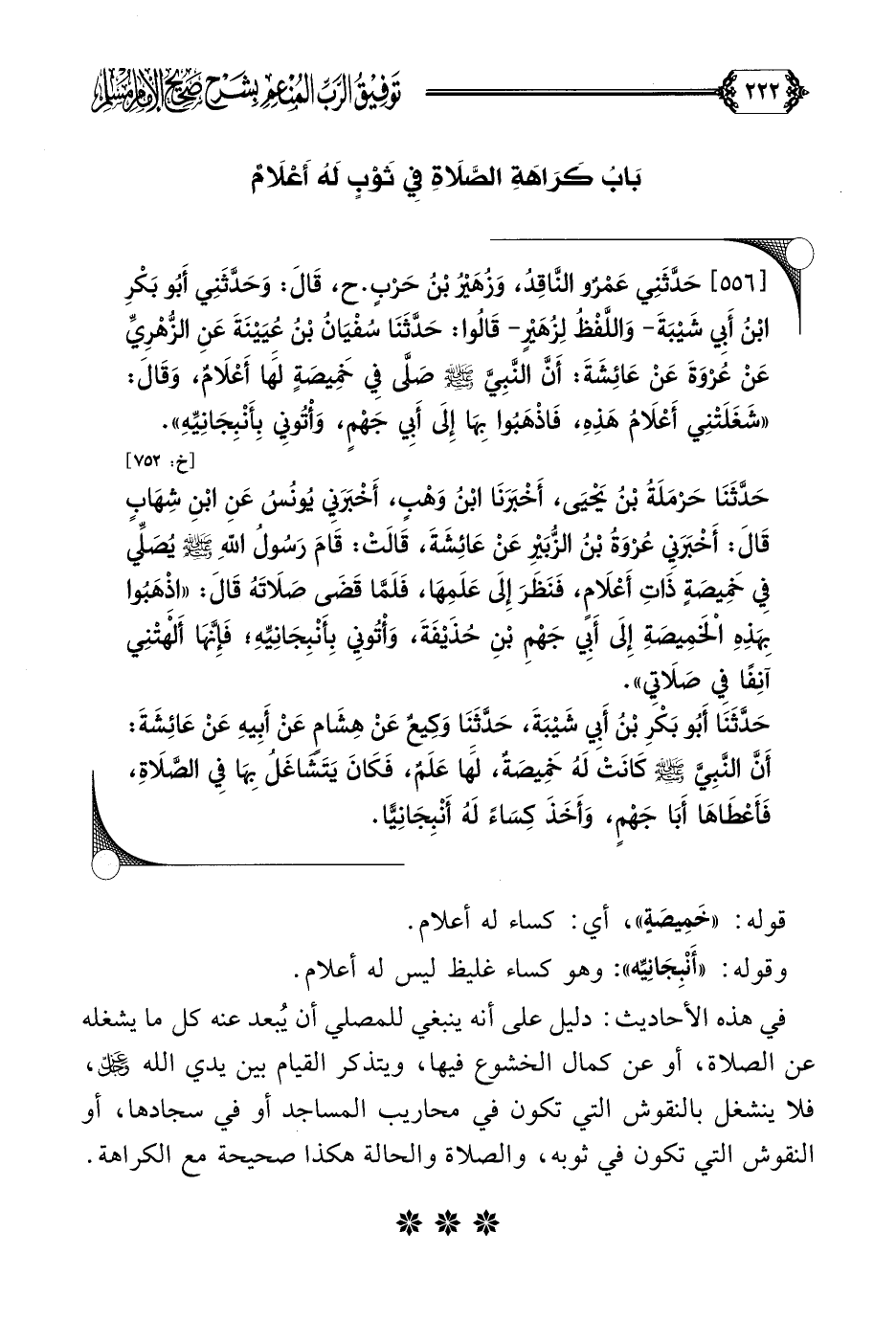 [٥٥٦] حَدَّثَنِي عَمْرٌو النَّاقِدُ، وَزُهَيْرُ بْنُ حَرْبٍ. ح، قَالَ: وَحَدَّثَنِي أَبُو بَكْرِ بْنُ أَبِي شَيْبَةَ- وَاللَّفْظُ لِزُهَيْرٍ- قَالُوا: حَدَّثَنَا سُفْيَانُ ابْنُ عُيَيْنَةَ عَنِ الزُّهْرِيِّ عَنْ عُرْوَةَ عَنْ عَائِشَةَ: أَنَّ النَّبِيَّ صلى الله عليه وسلم صَلَّى فِي خَمِيصَةٍ لَهَا أَعْلَامٌ، وَقَالَ: ((شَغَلَتْنِي أَعْلَامُ هَذِهِ، فَاذْهَبُوا بِهَا إِلَى أَبِي جَهْمٍ، وَأْتُونِي بِأَنْبِجَانِيِّهِ)).